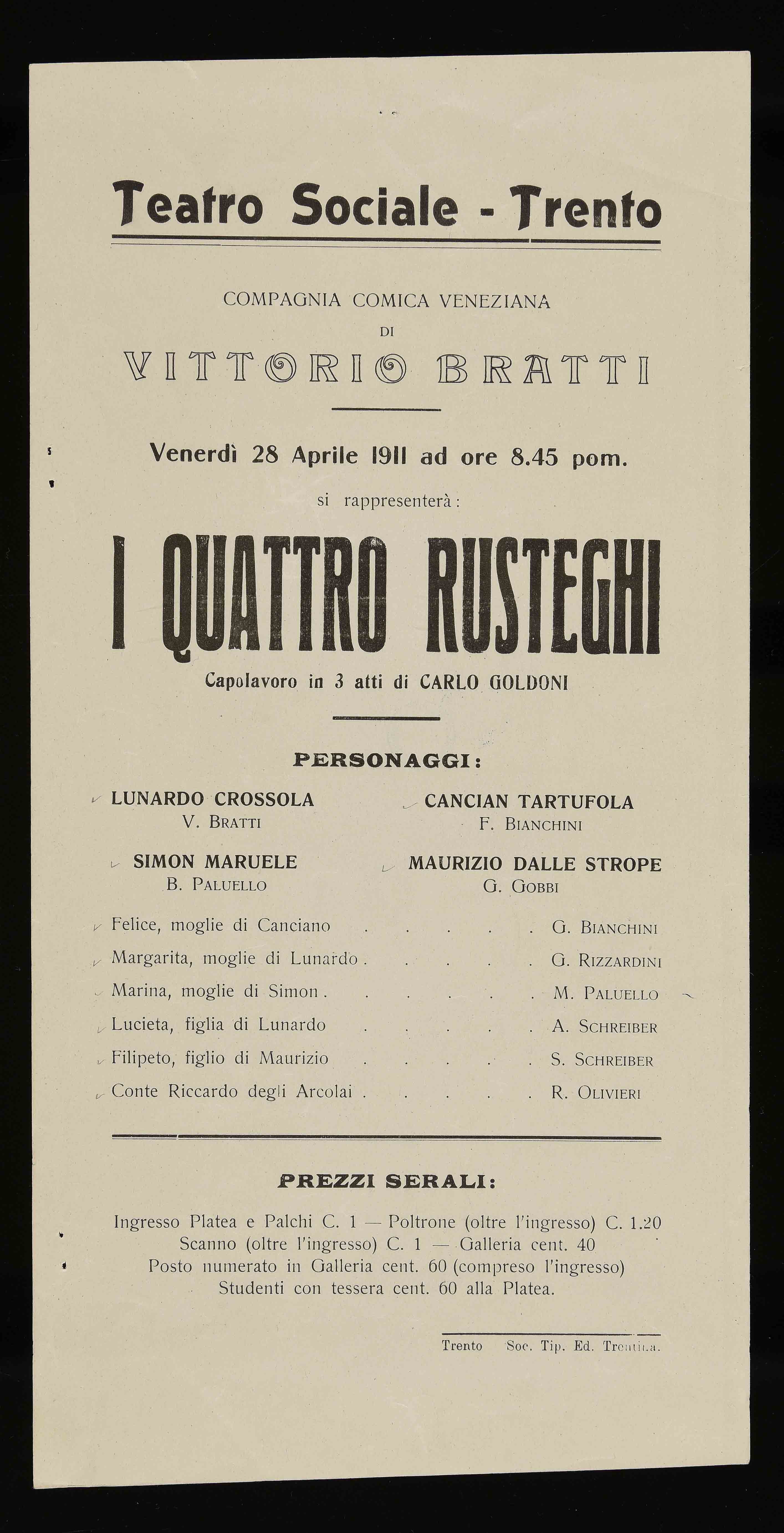 Teatro Sociale – Trento. Venerdì 28 aprile 1911, alle ore 8.45 pom.