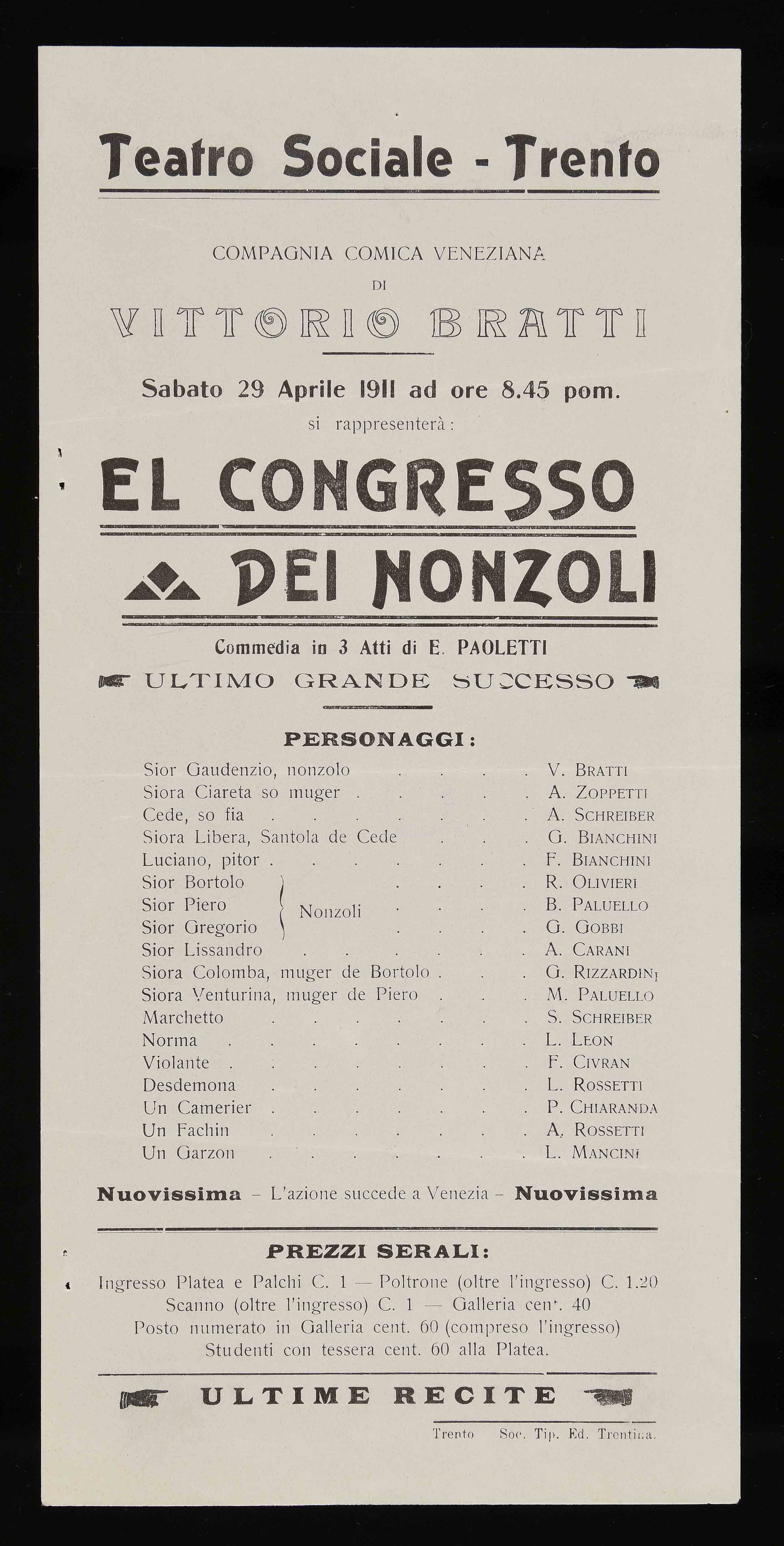 Teatro Sociale – Trento. Sabato 29 aprile 1911, alle ore 8.45 pom.