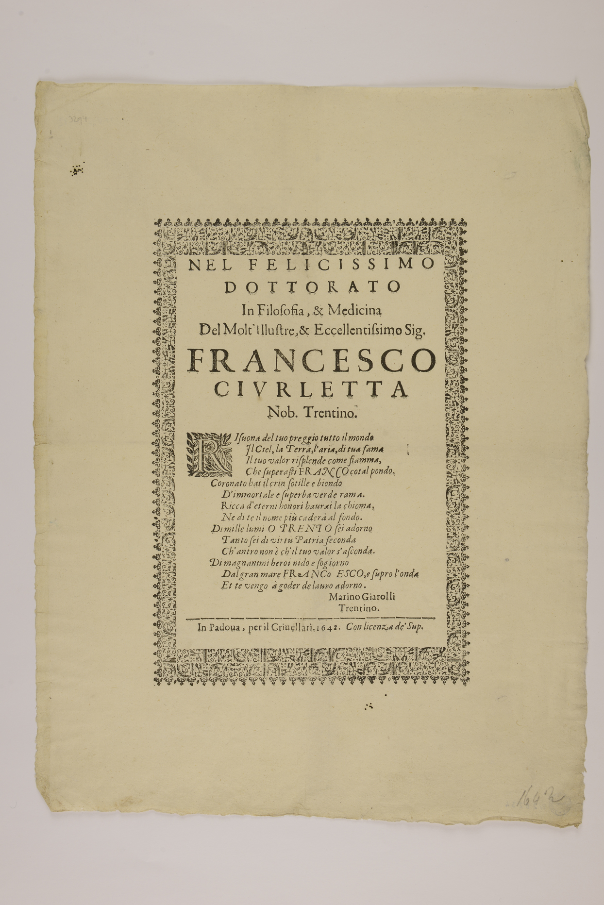 | Nel felicissimo dottorato in filosofia & medicina del molt'illustre & eccellentissimo sig. Francesco Ciurletta nob. trentino |