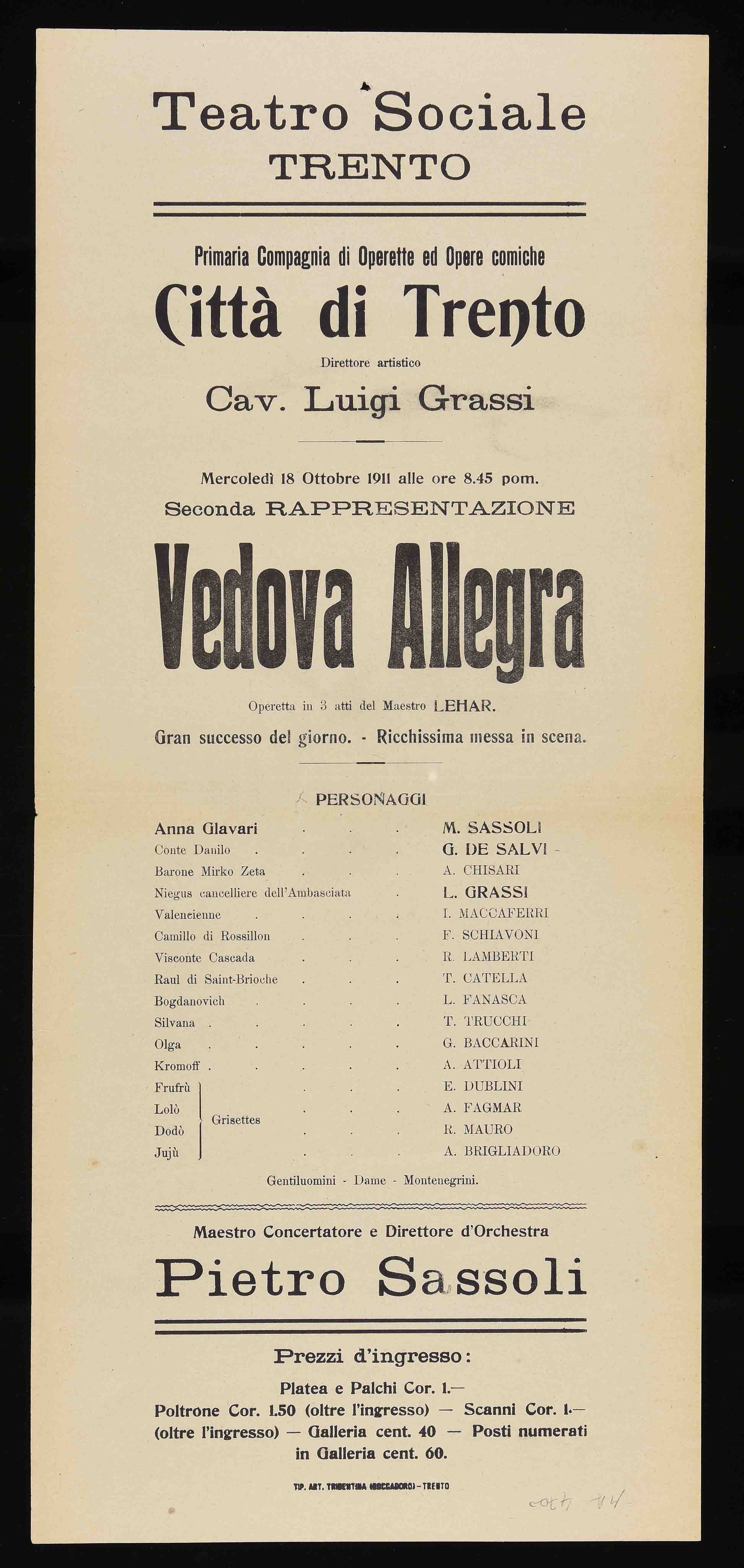 | Teatro Sociale Trento. Primaria compagnia di operette ed opere comiche Città di Trento. Direttore artistico cav. Luigi Grassi. Mercoledì 18 ottobre 1911 alle ore 8.45 pom. |