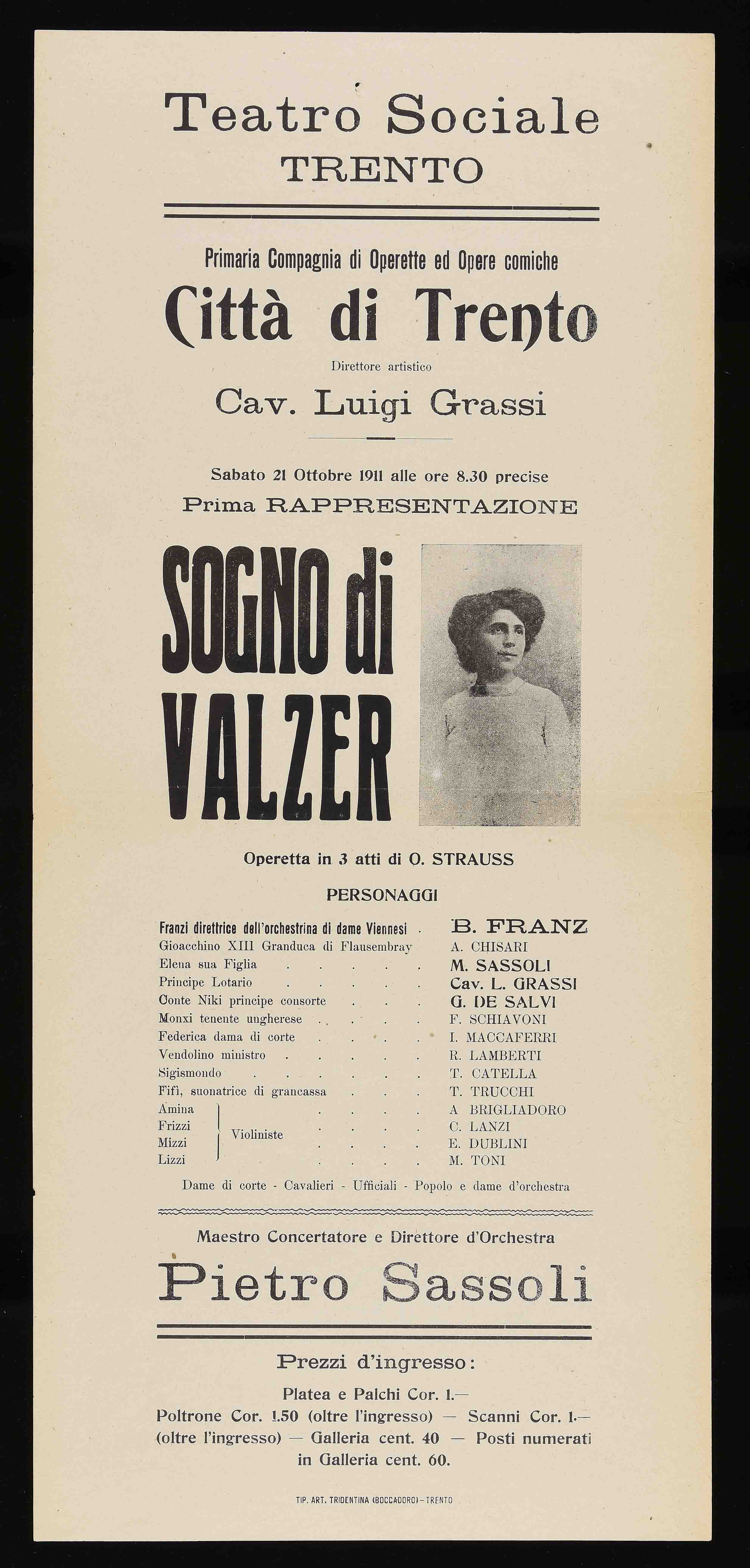 | Teatro Sociale Trento. Primaria compagnia di operette ed opere comiche Città di Trento. Direttore artistico cav. Luigi Grassi. Sabato 21 ottobre 1911 ad ore 8.30 precise |