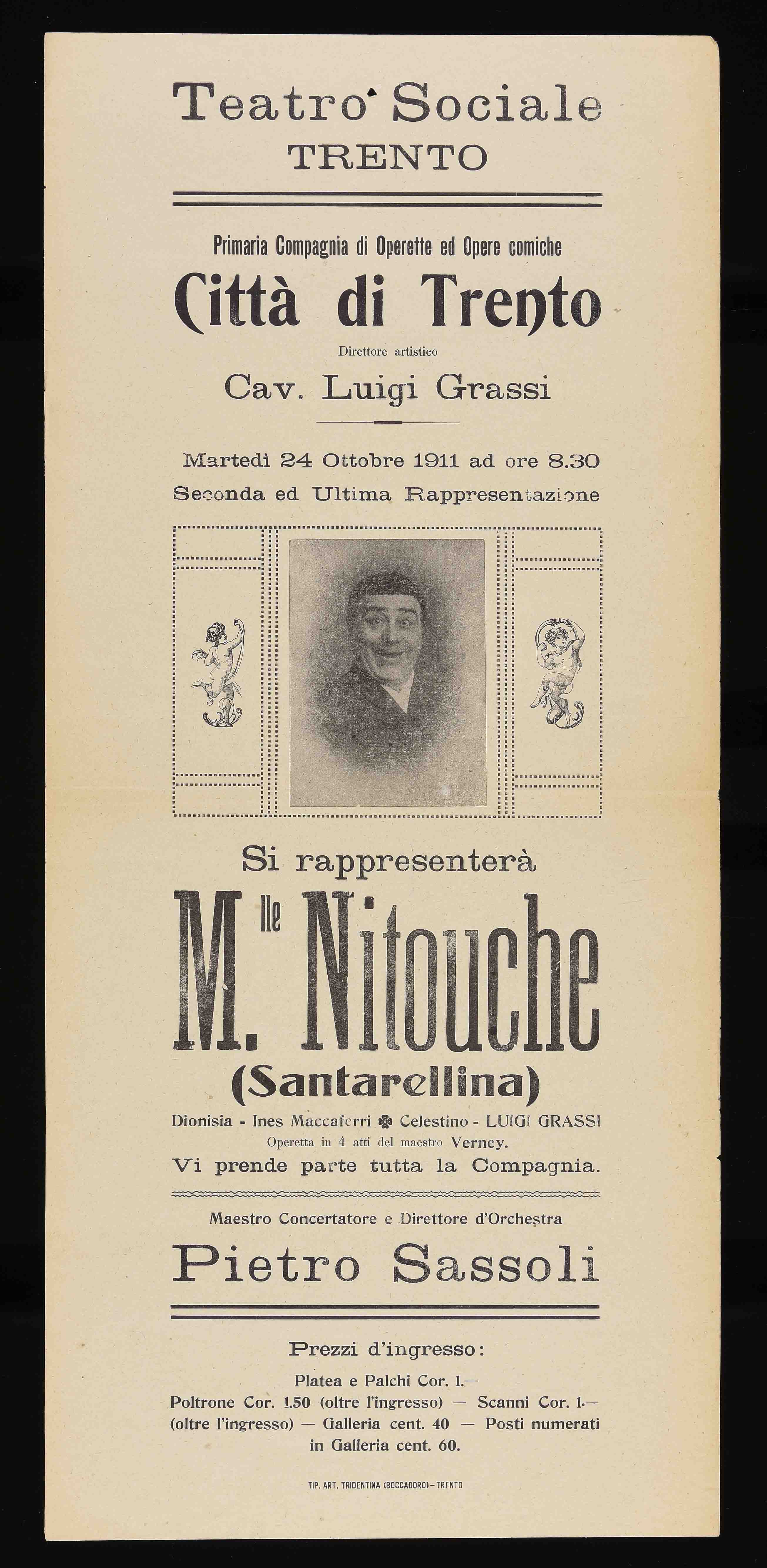 | Teatro Sociale Trento. Primaria compagnia di operette ed opere comiche Città di Trento. Direttore artistico cav. Luigi Grassi. Martedì 24 ottobre 1911 ad ore 8.30 |
