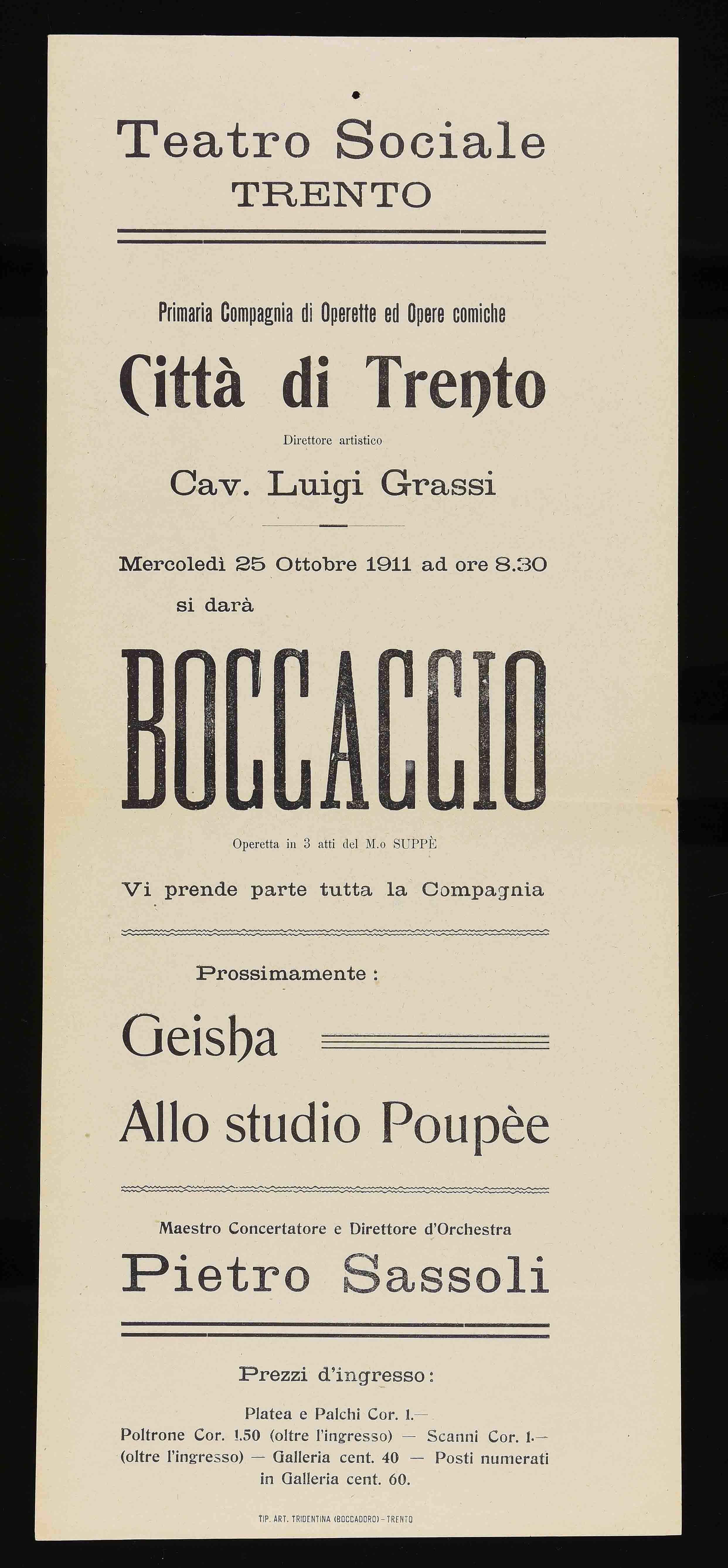 | Teatro Sociale Trento. Primaria compagnia di operette ed opere comiche Città di Trento. Direttore artistico cav. Luigi Grassi. Mercoledì 25 ottobre 1911 ad ore 8.30 |