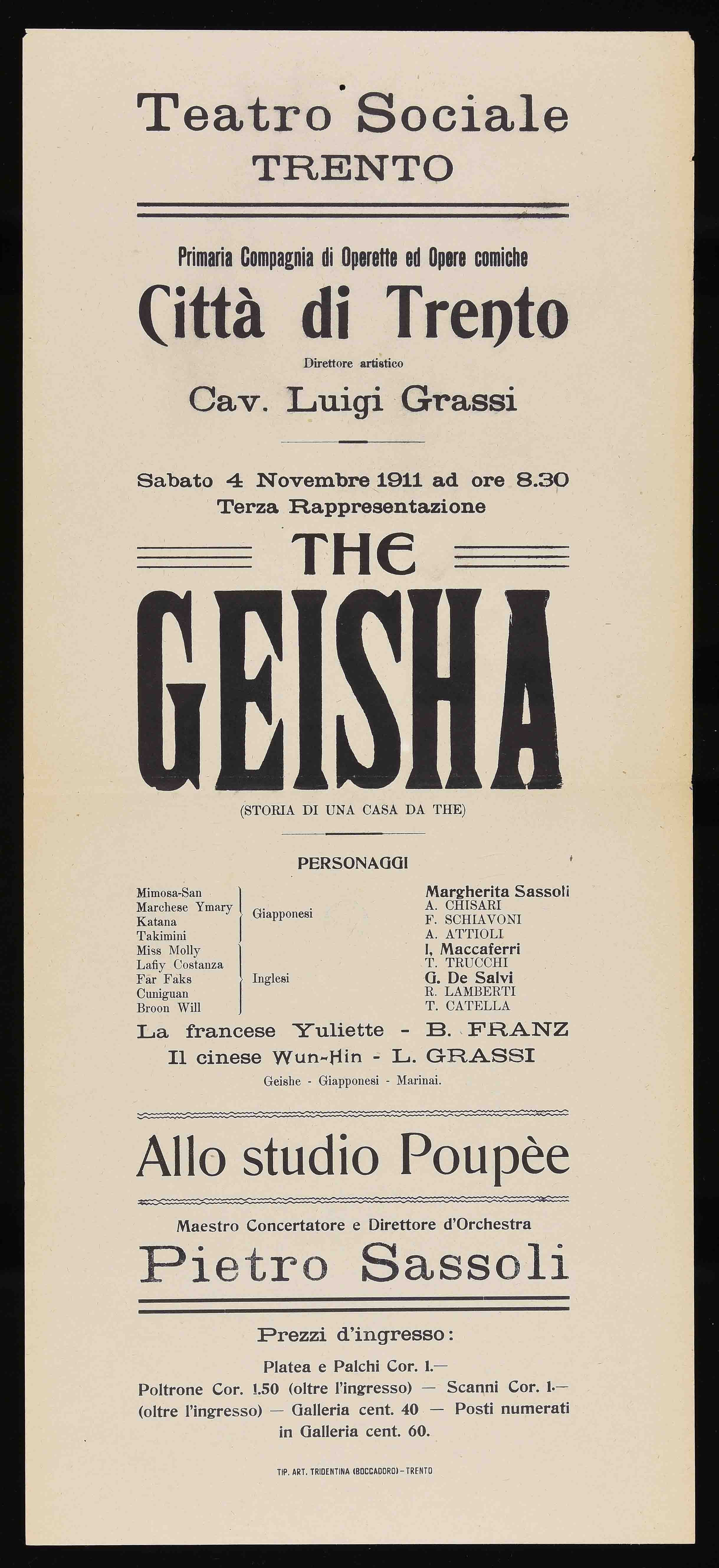 | Teatro Sociale Trento. Primaria compagnia di operette ed opere comiche Città di Trento. Direttore artistico cav. Luigi Grassi. Sabato 4 novembre 1911 ad ore 8.30 |