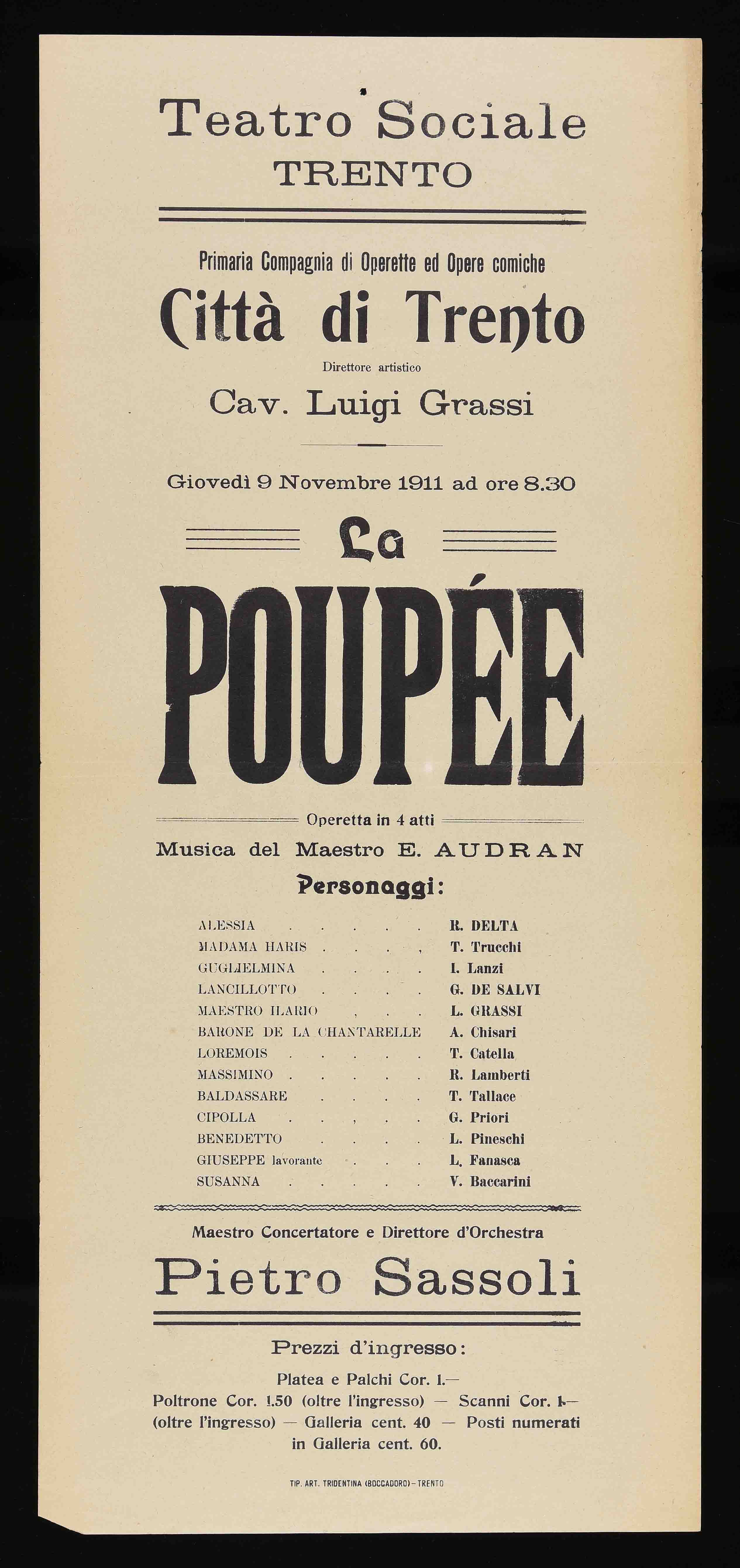| Teatro Sociale Trento. Primaria compagnia di operette ed opere comiche Città di Trento. Direttore artistico cav. Luigi Grassi. Giovedì 9 novembre 1911 ad ore 8.30 |