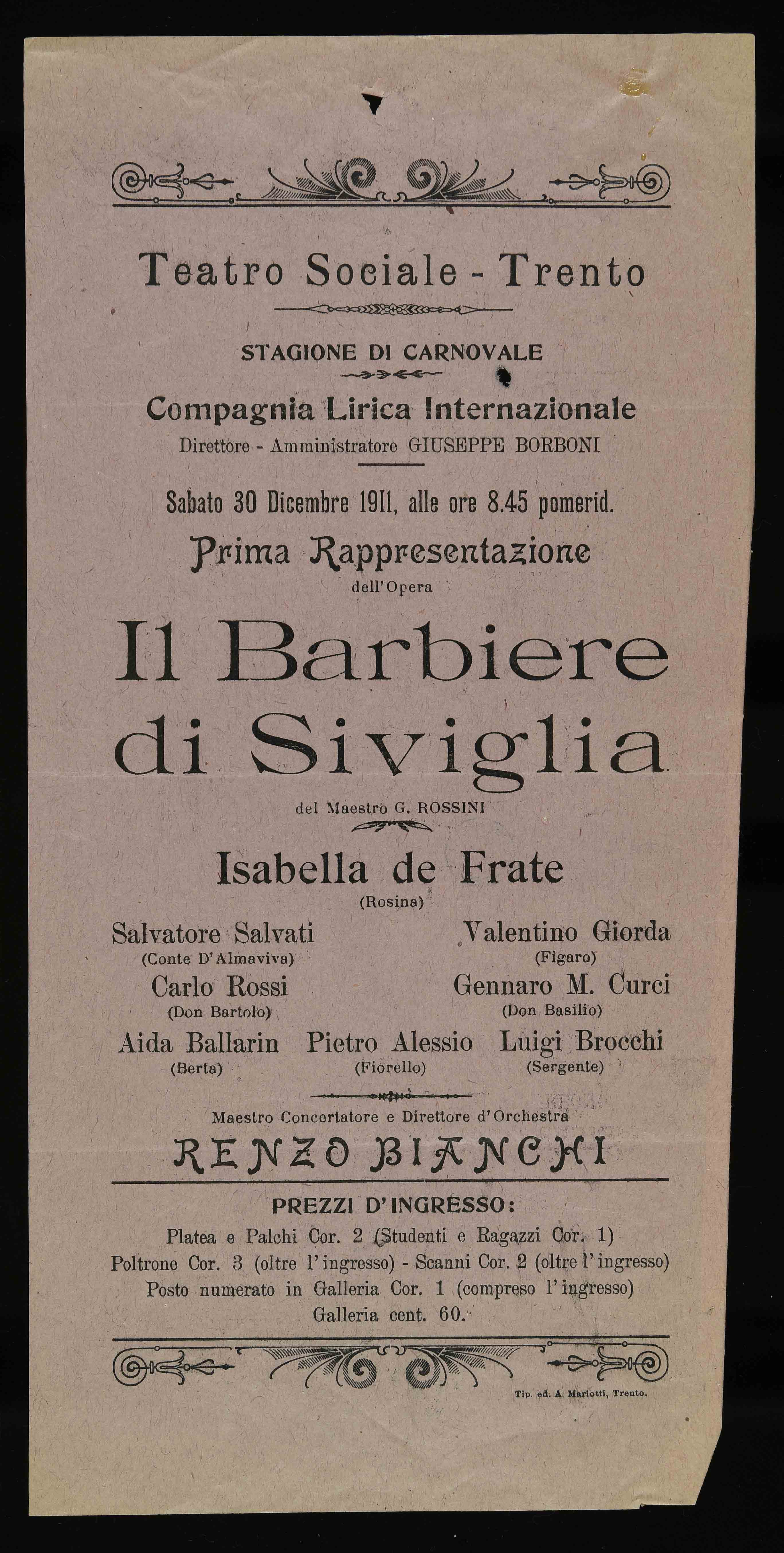 | Teatro Sociale – Trento. Stagione di carnovale. Sabato 30 dicembre 1911, alle ore 8.45 pomerid. |