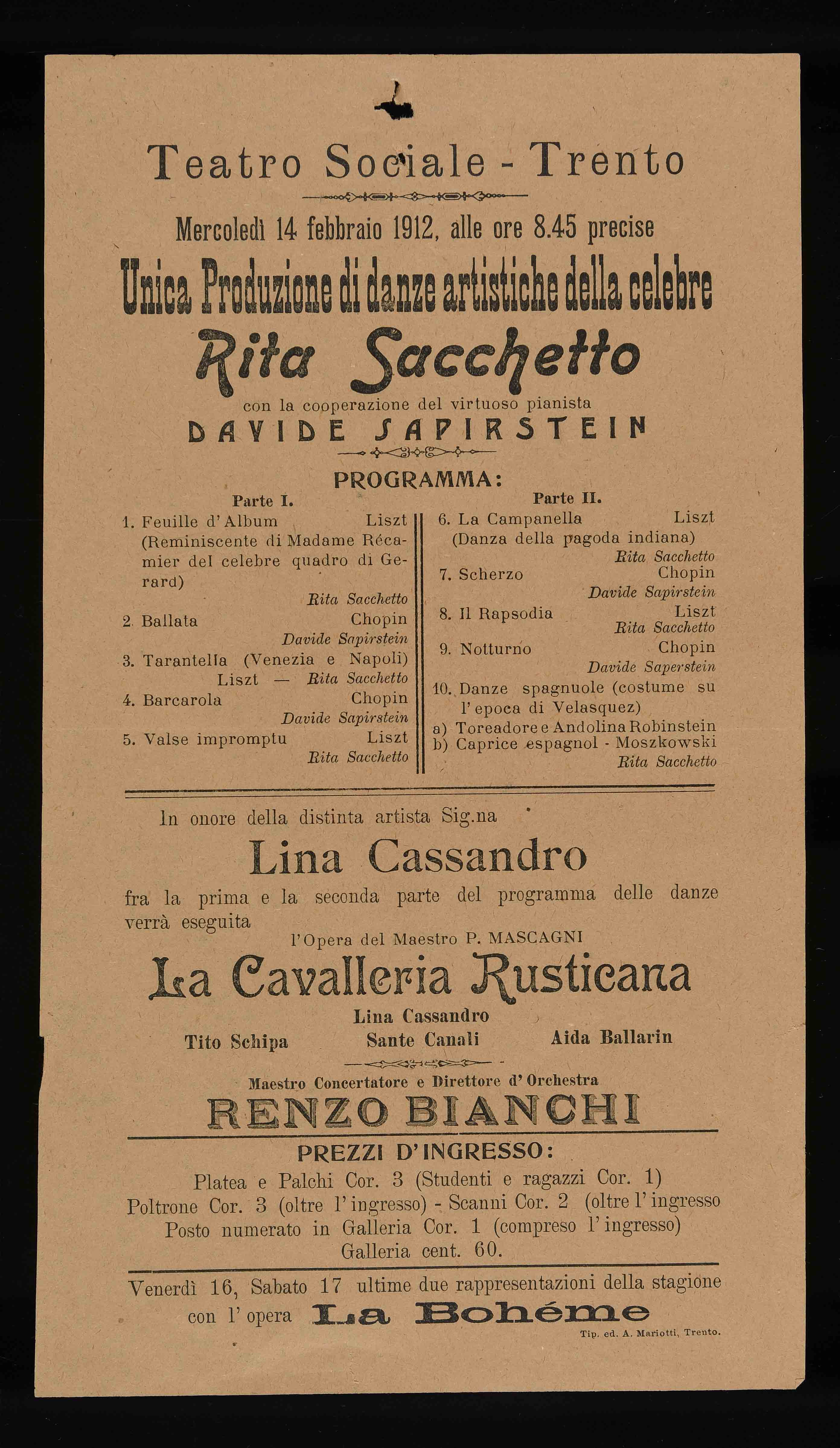 | Teatro Sociale – Trento. Mercoledì 14 febbraio 1912, alle ore 8.45 precise. Unica produzione di danze artistiche della celebre Rita Sacchetto |