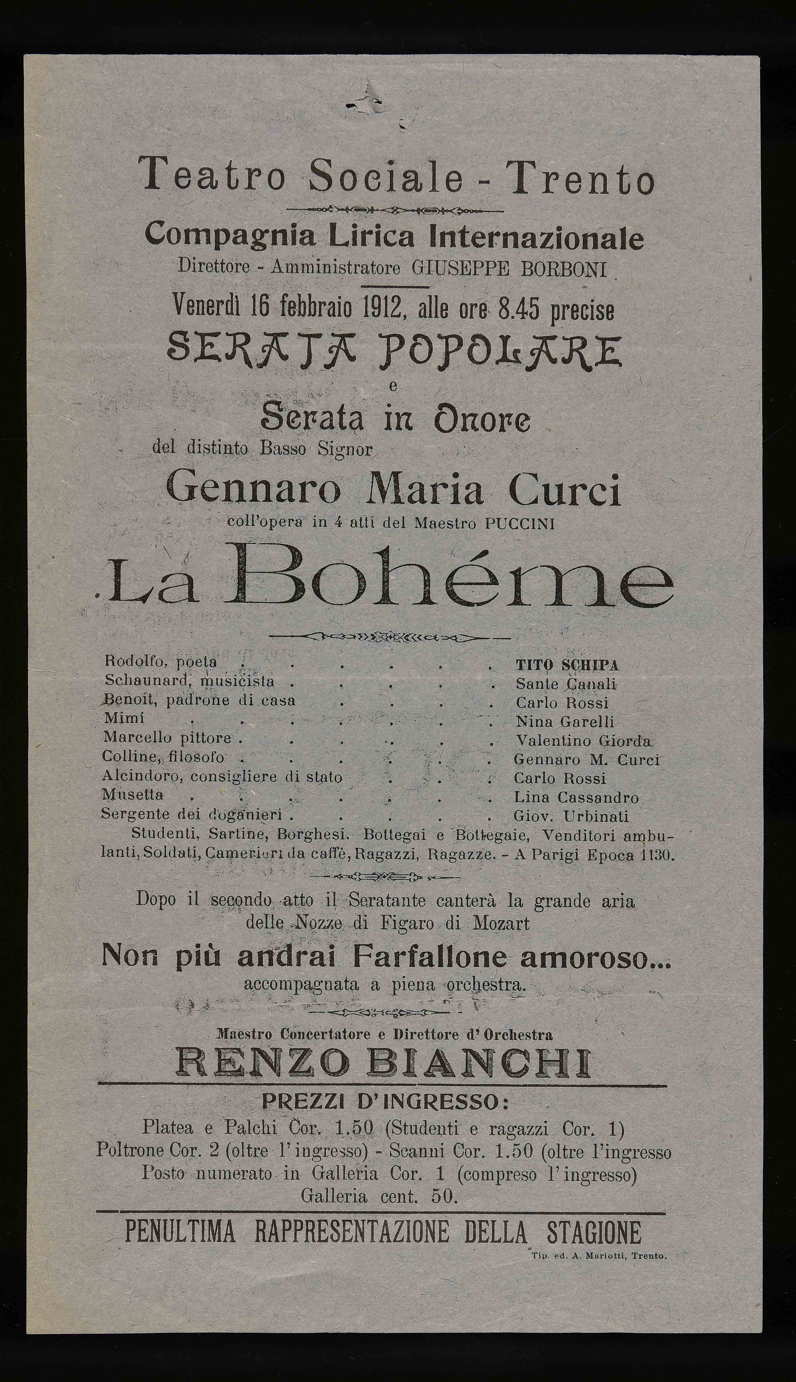 Teatro Sociale – Trento. Venerdì 16 febbraio 1912, alle ore 8.45 precise