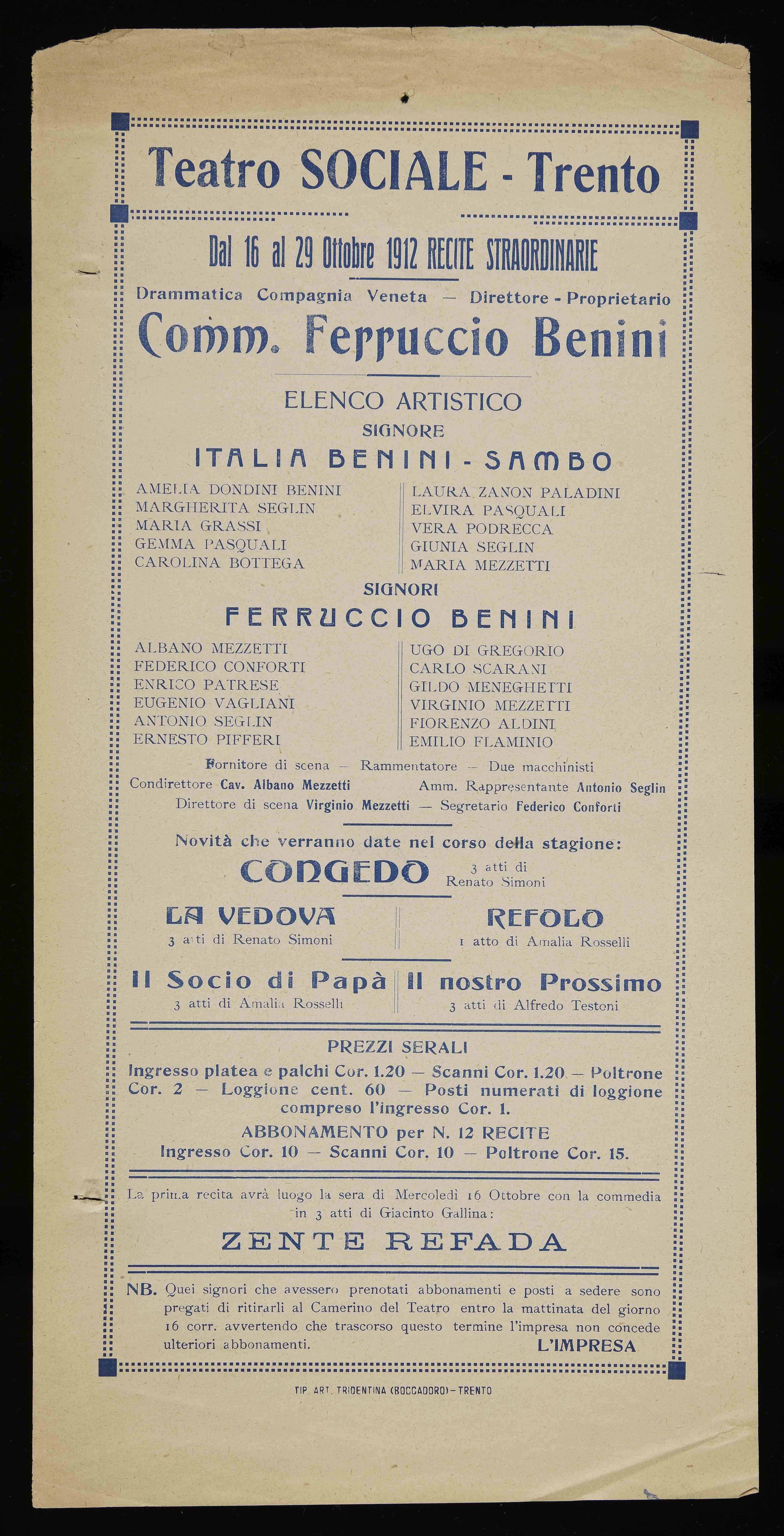 | Teatro Sociale – Trento. Dal 16 al 29 ottobre 1912 recite straordinarie. Drammatica compagnia veneta. Direttore-proprietario Comm. Ferruccio Benini |