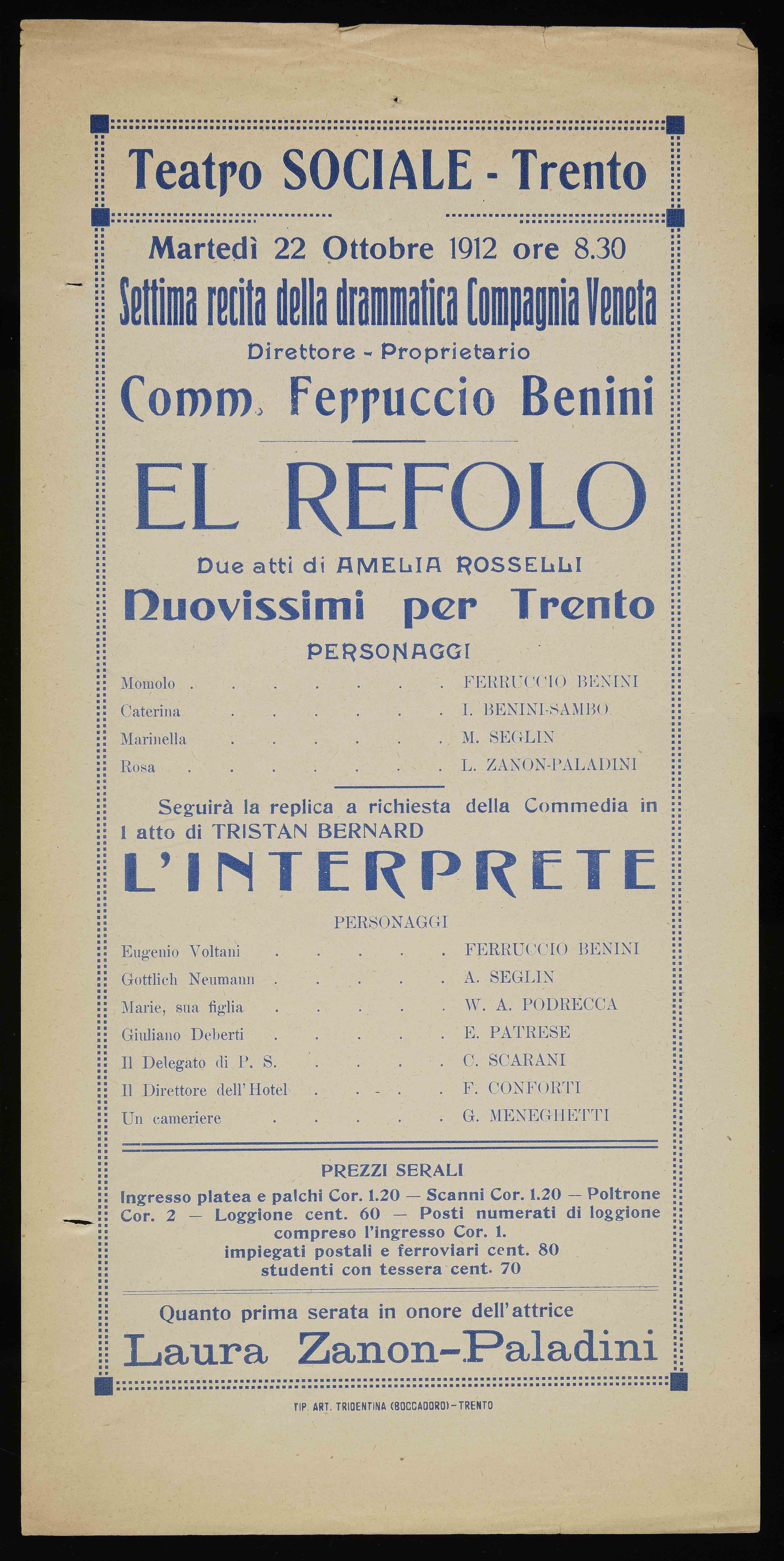 Teatro Sociale – Trento. Martedì 22 ottobre 1912 ore 8.30