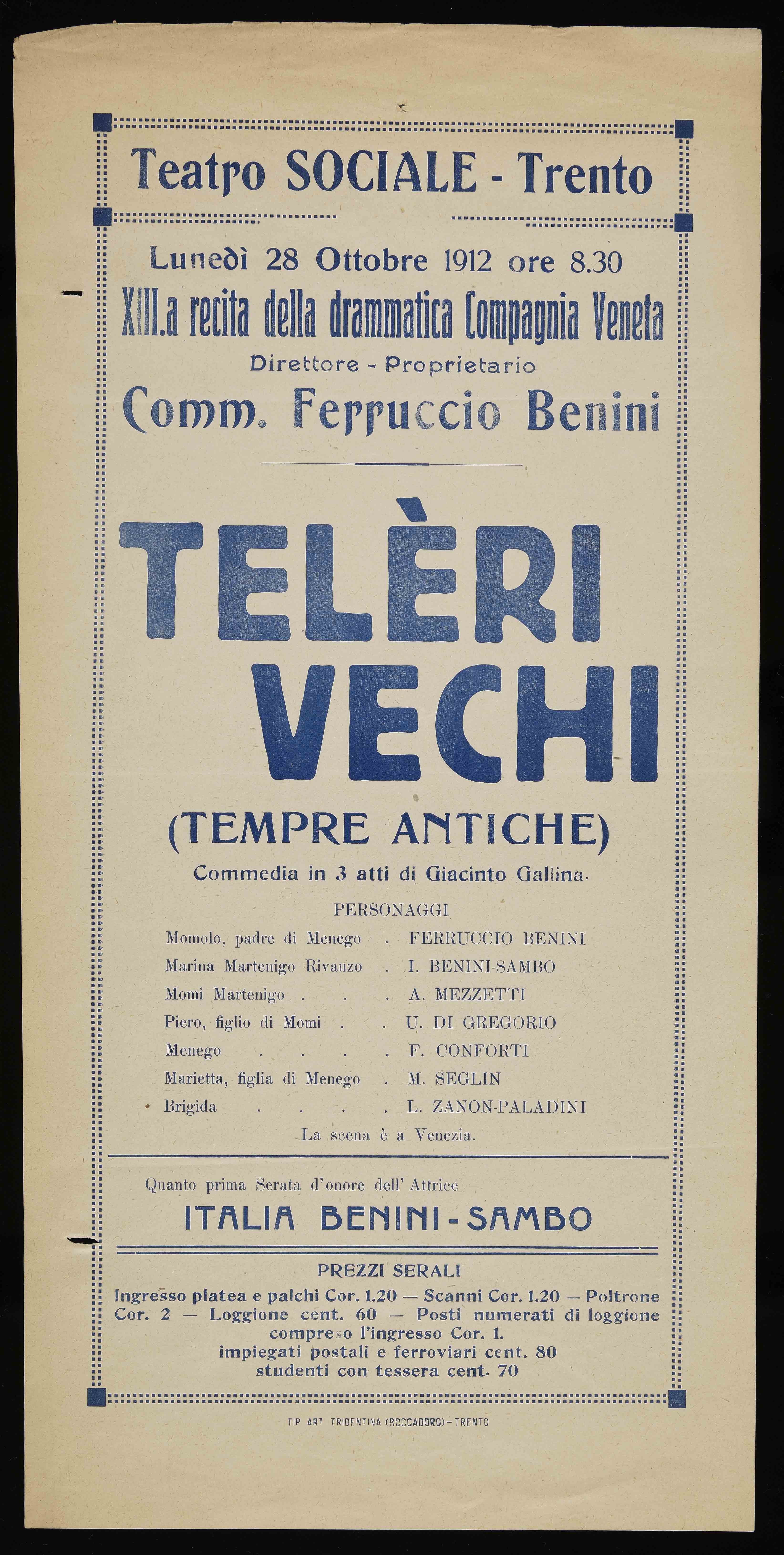Teatro Sociale – Trento. Lunedì 28 ottobre 1912 ore 8.30