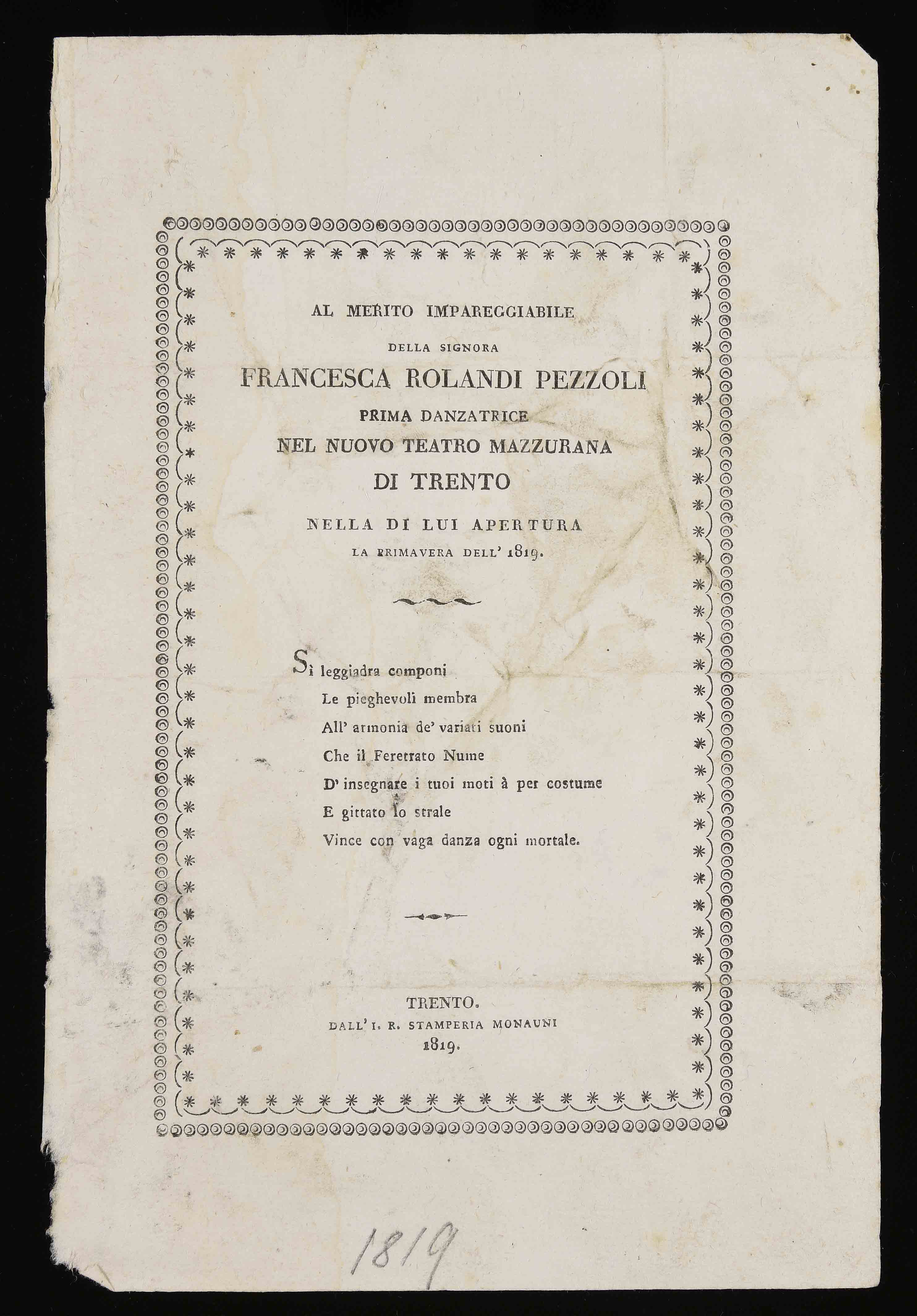 | Al merito impareggiabile della signora Francesca Rolandi Pezzoli prima danzatrice nel nuovo Teatro Mazzurana di Trento nella di lui apertura la primavera dell'1819 |