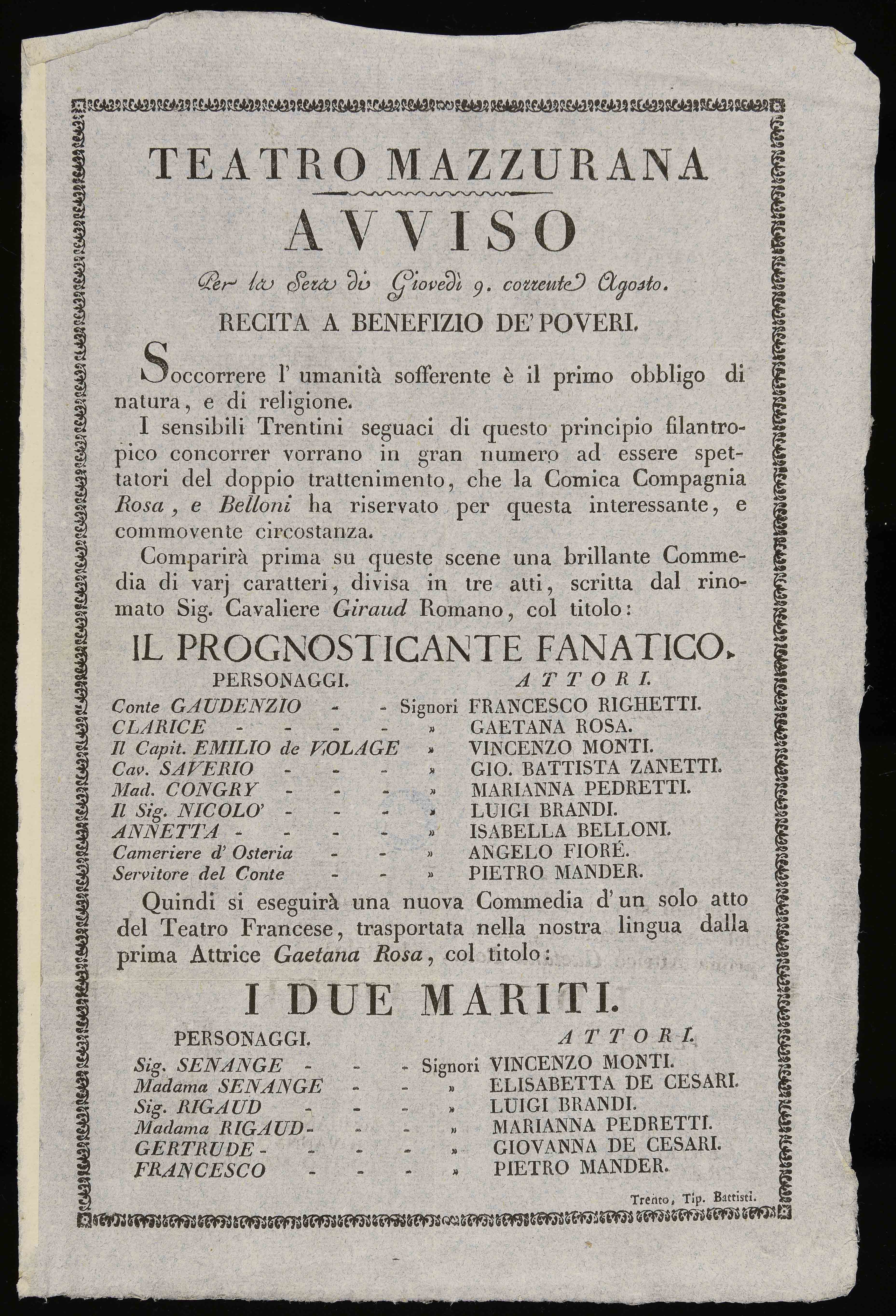 Teatro Mazzurana. Avviso per la sera di giovedì 9. corrente agosto