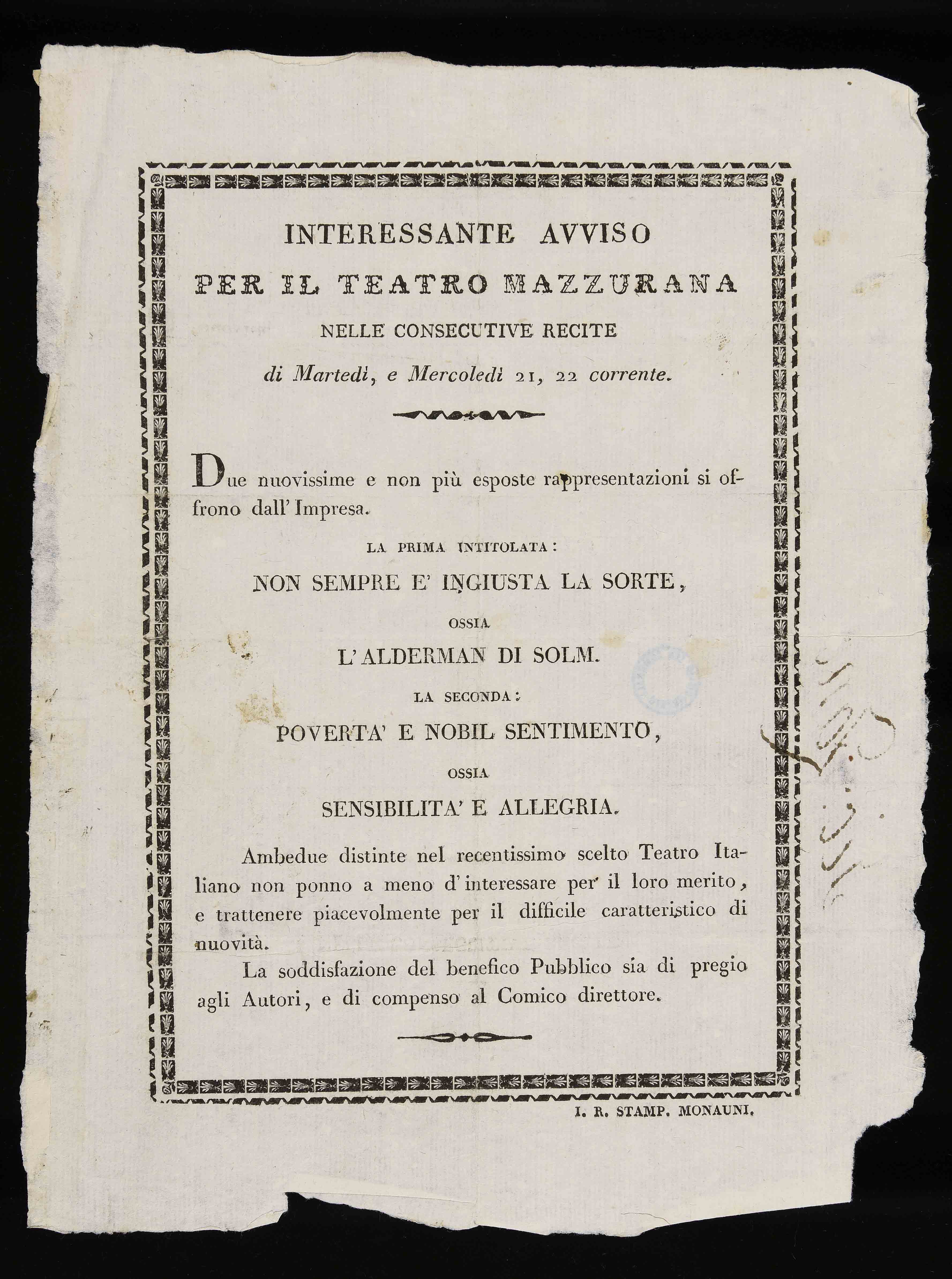 | Interessante avviso per il Teatro Mazzurana nelle consecutive recite di martedì, e mercoledì 21, 22 corrente |