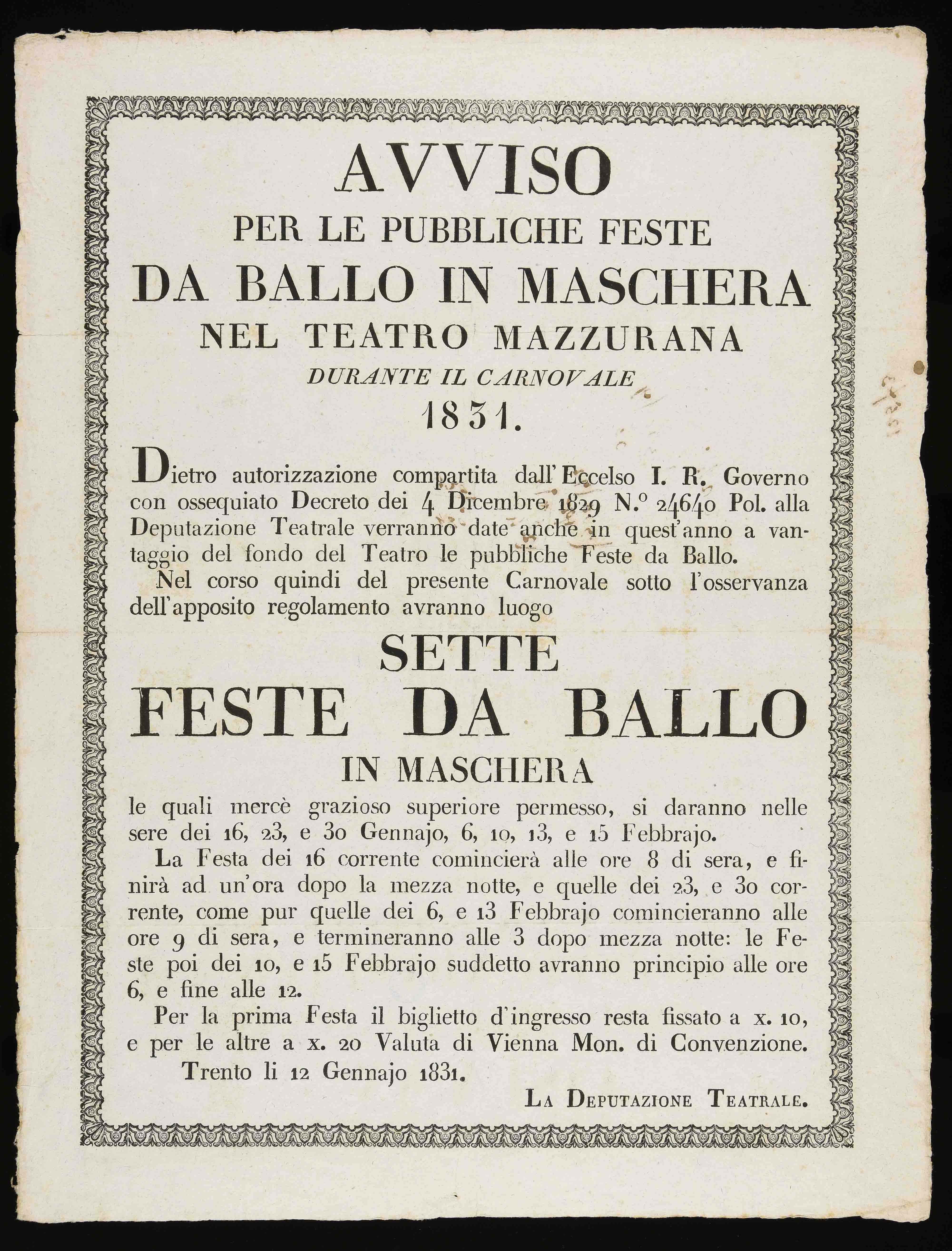 | Avviso per le pubbliche feste da ballo in maschera nel teatro Mazzurana durante il carnovale 1831 |