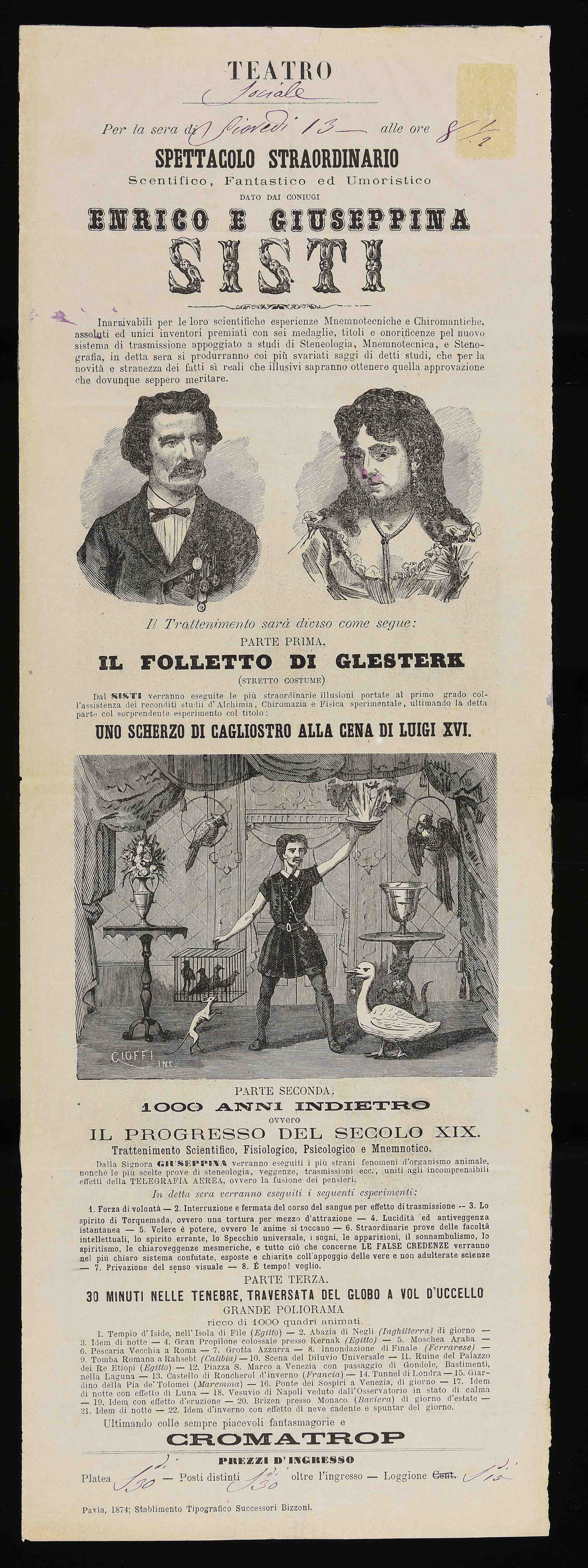 | Spettacolo straordinario scentifico, fantastico ed umoristico dato dai coniugi Enrico e Giuseppina Sisti |