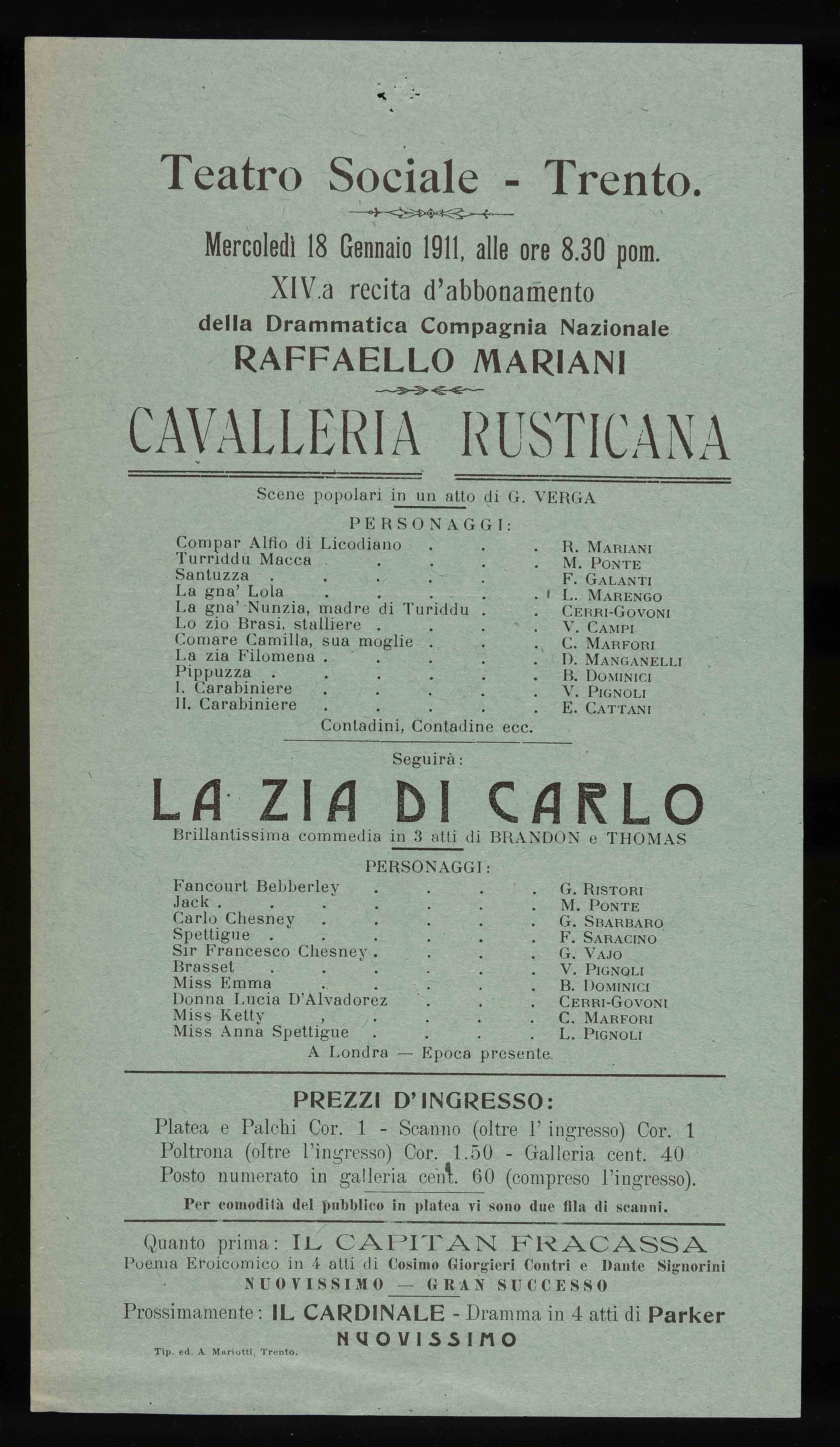 Teatro sociale – Trento. Mercoledì 18 gennaio 1911, alle ore 8.30 pom....