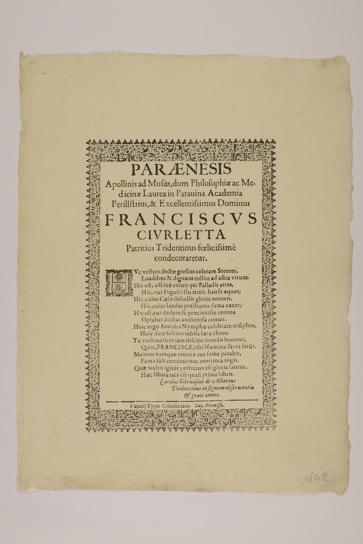 | Paraenesis Apollinis ad Musus dum philosophiae ac medicinae laurea in Patavina Academia perillstrius & excellentissimus dominus Franciscus Ciurletta patritius Tridentinus foelicissimè condecoraretur |