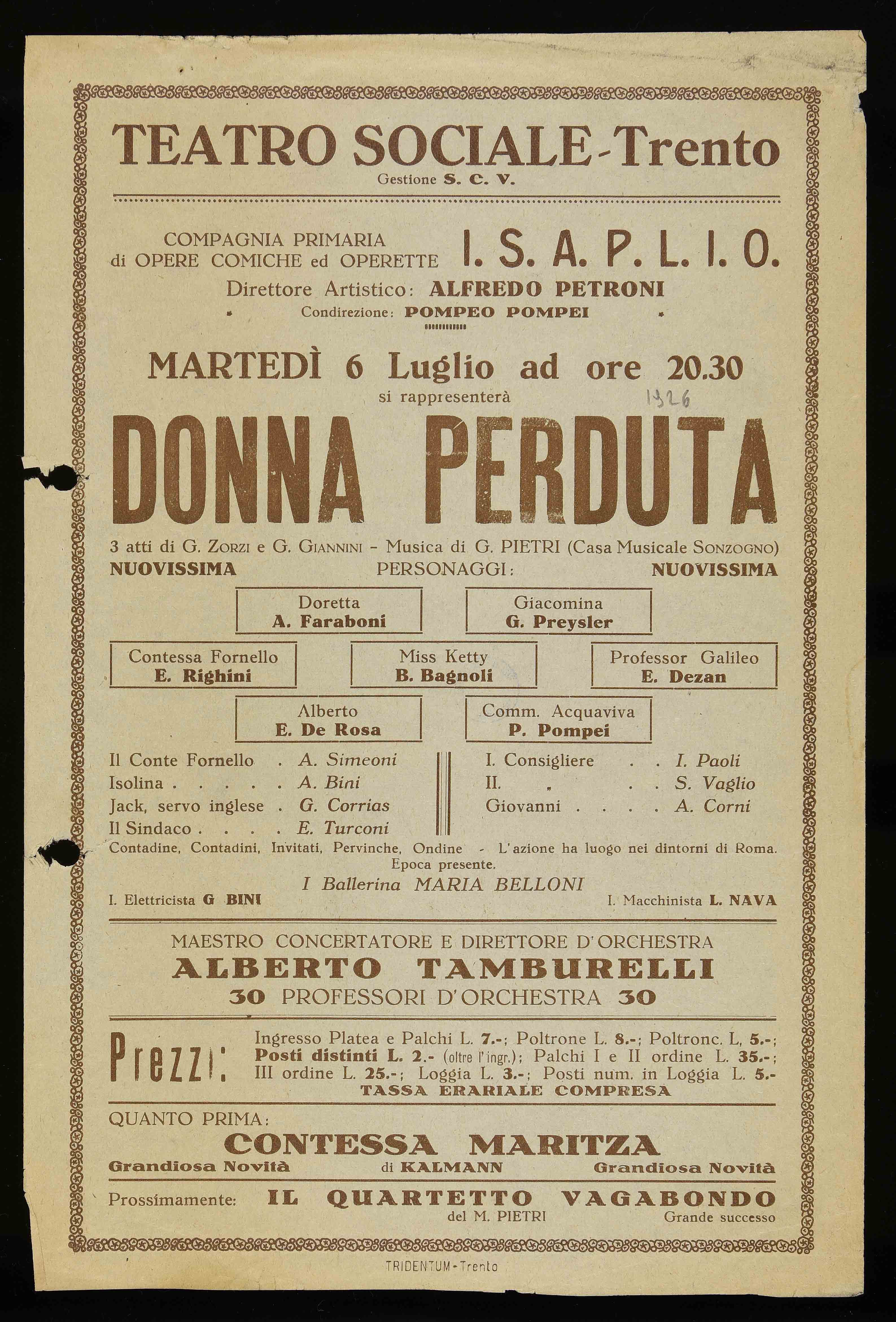 | Teatro Sociale – Trento. Martedì 6 luglio ad ore 20.30 si rappresenterà Donna perduta |