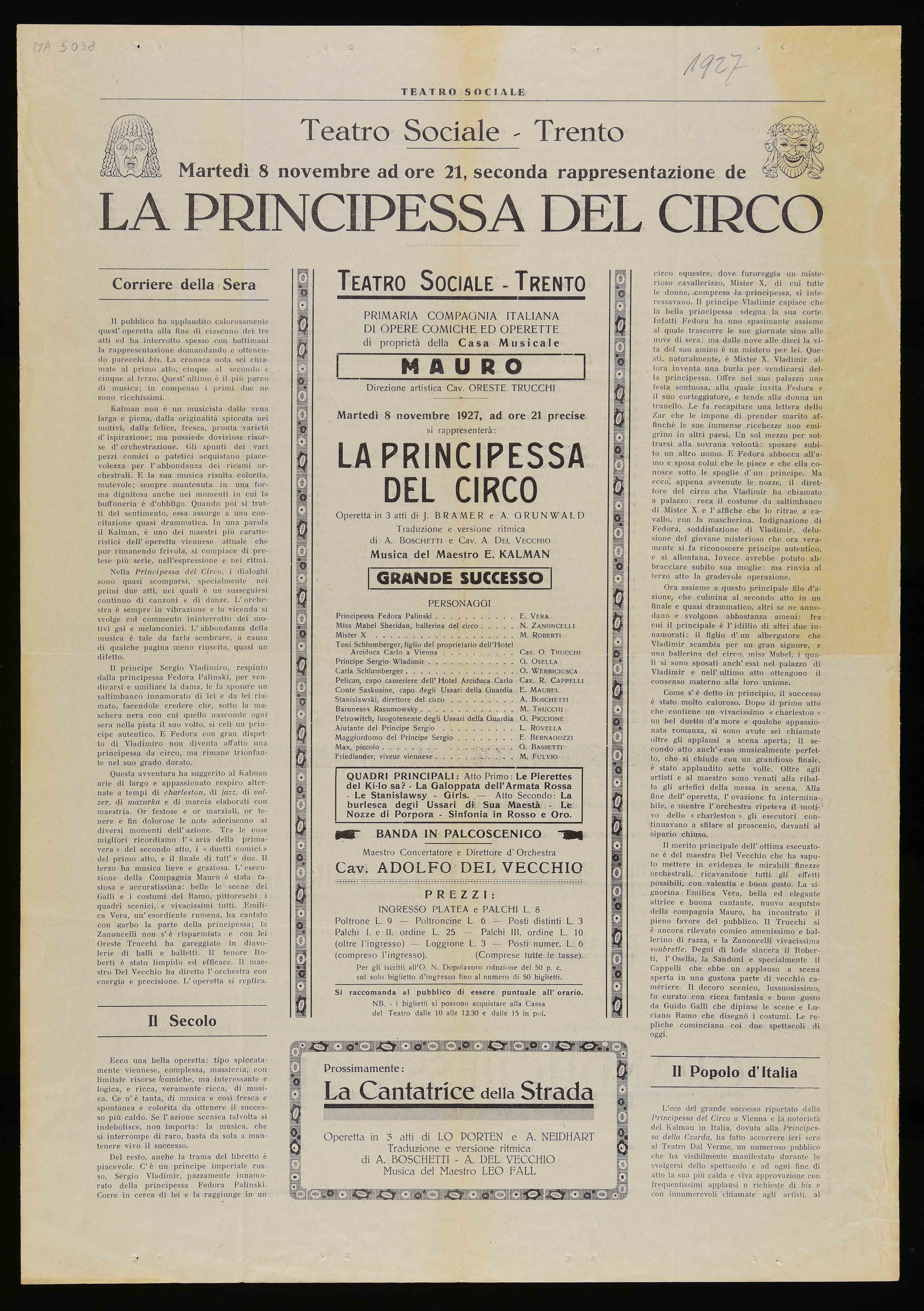 | Teatro Sociale – Trento. Martedì 8 novembre ad ore 21, seconda rappresentazione de La principessa del circo |