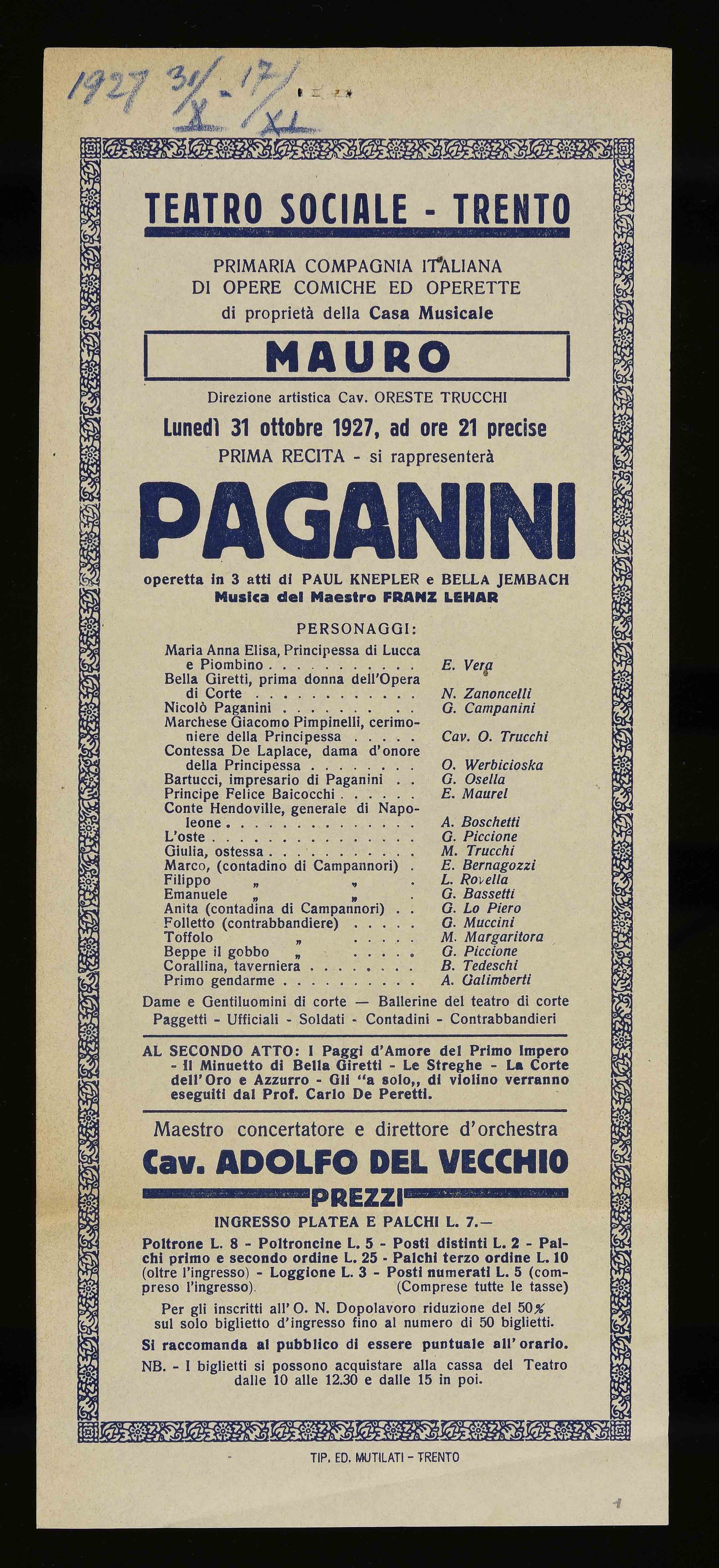 | Teatro Sociale – Trento. Lunedì 31 ottobre 1927, ad ore 21 precise |