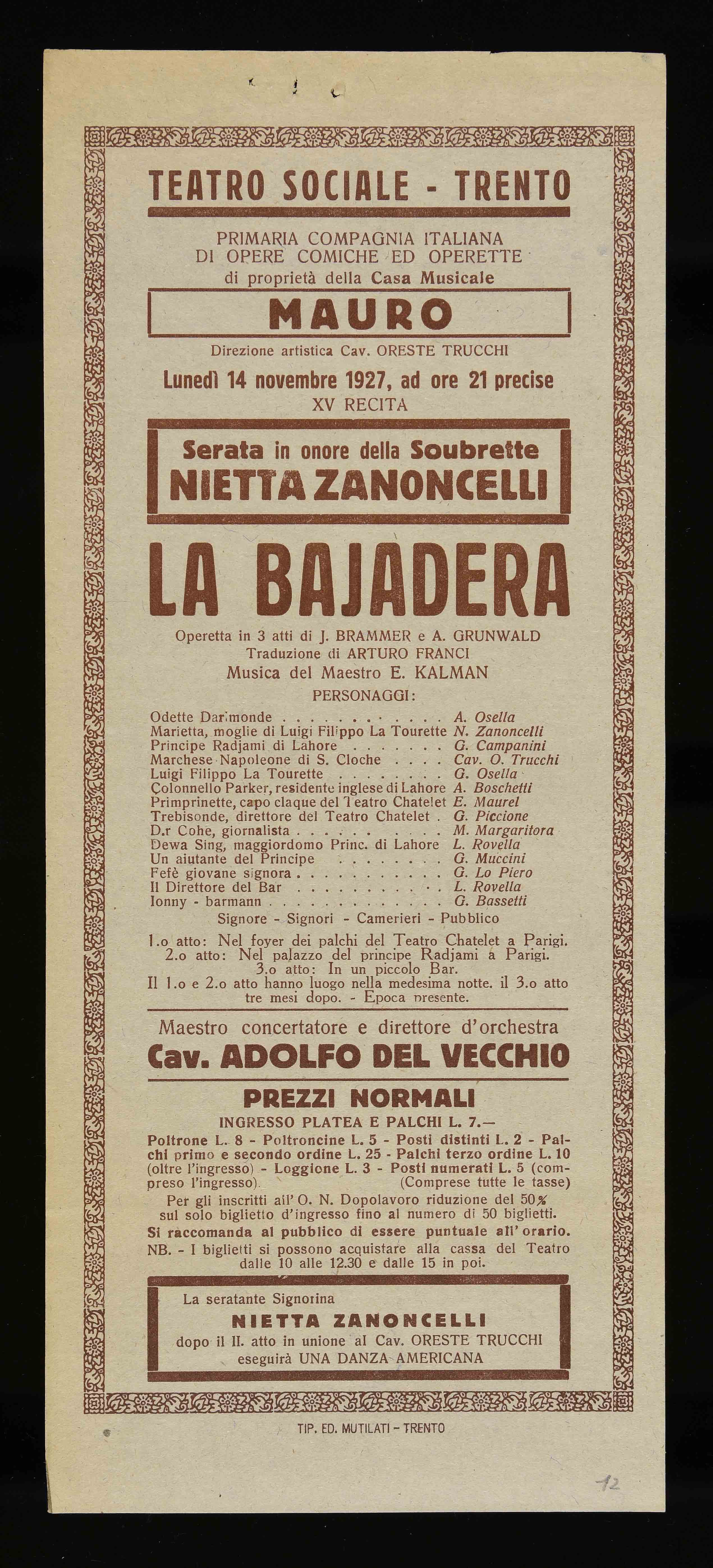 | Teatro Sociale – Trento. Lunedì 14 novembre 1927, ad ore 21 precise |