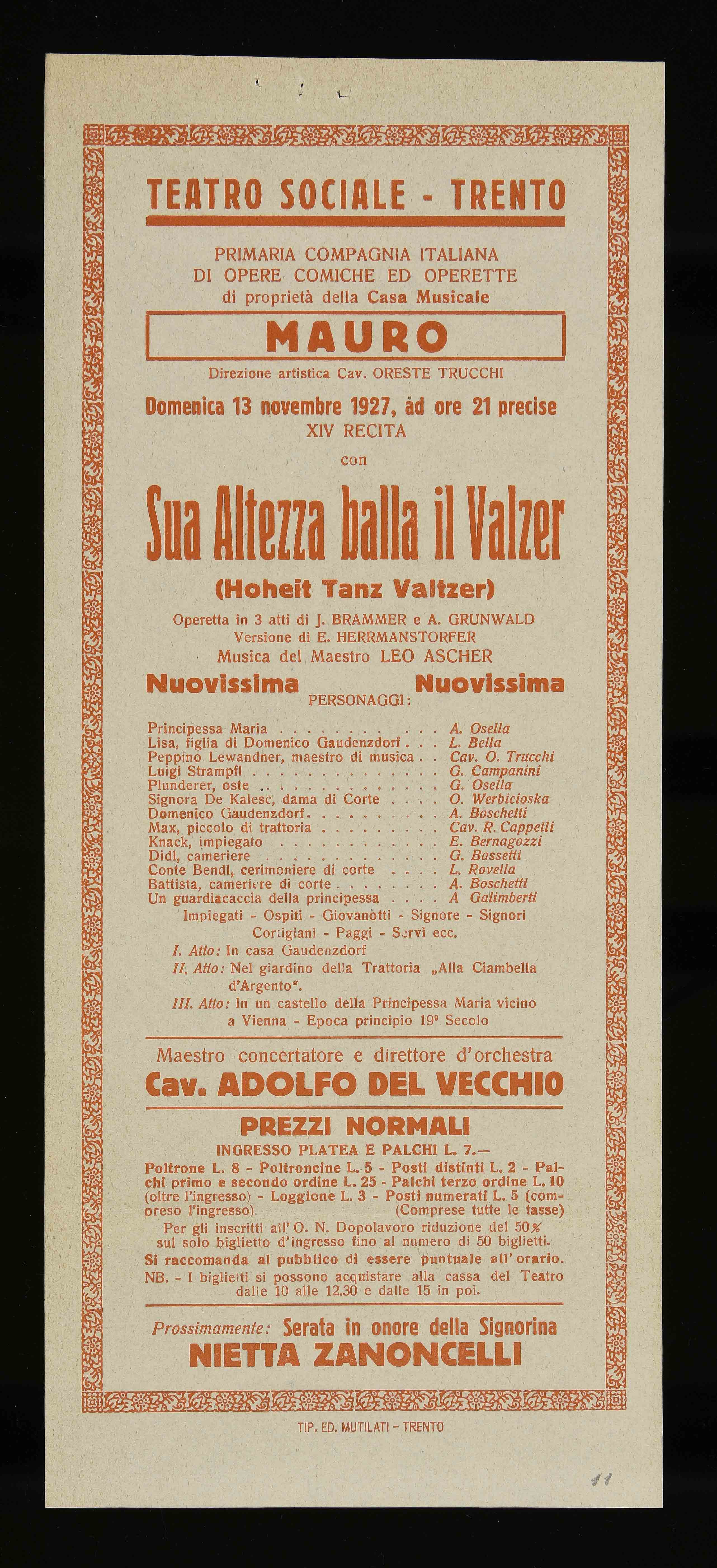 Teatro Sociale – Trento. Domenica 13 novembre 1927, ad ore 21 precise