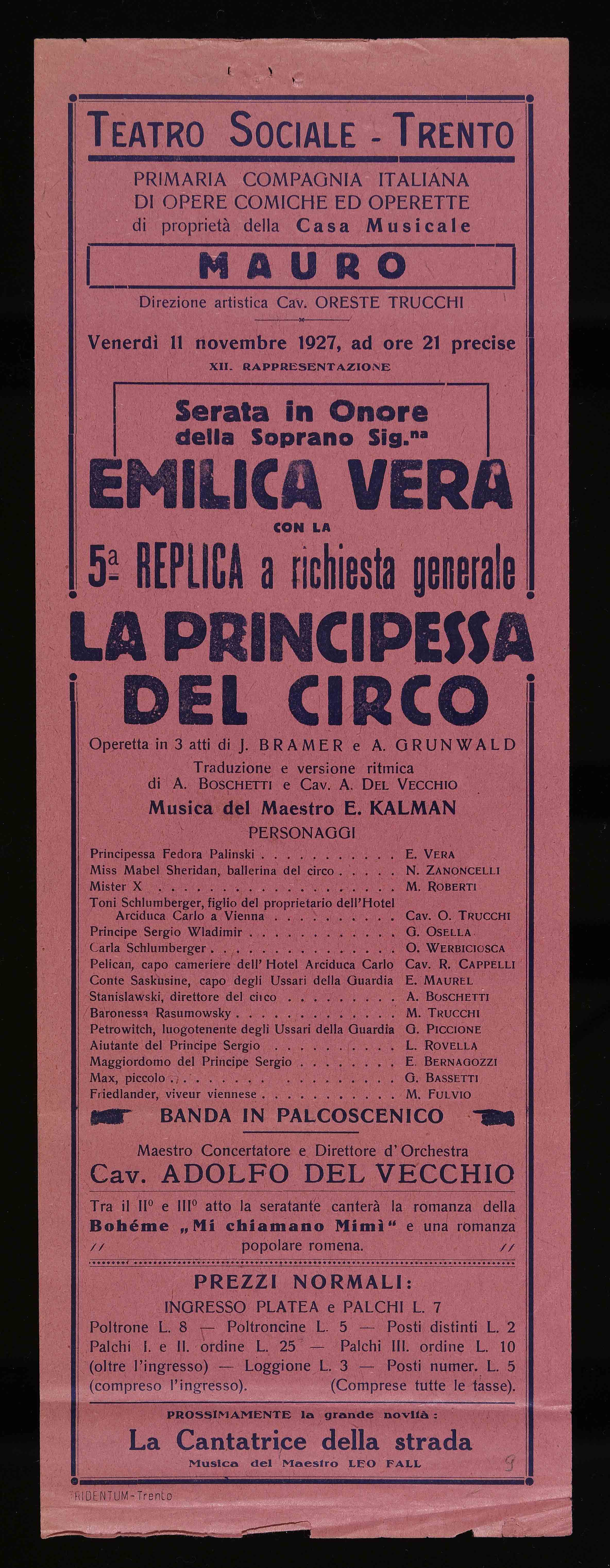 | Teatro Sociale – Trento. Venerdì 11 novembre 1927, ad ore 21 precise |