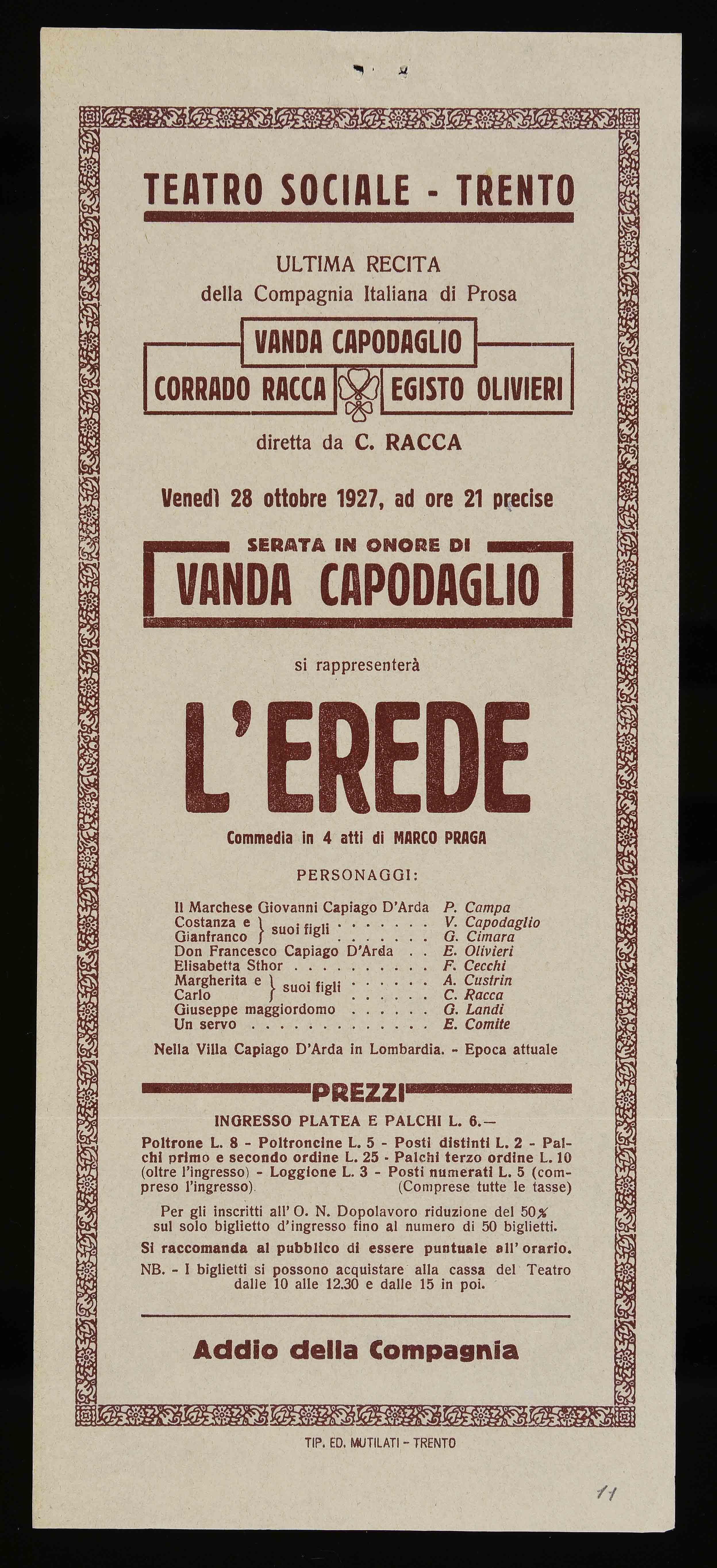 | Teatro Sociale – Trento. Venerdì 28 ottobre 1927, ad ore 21 precise |