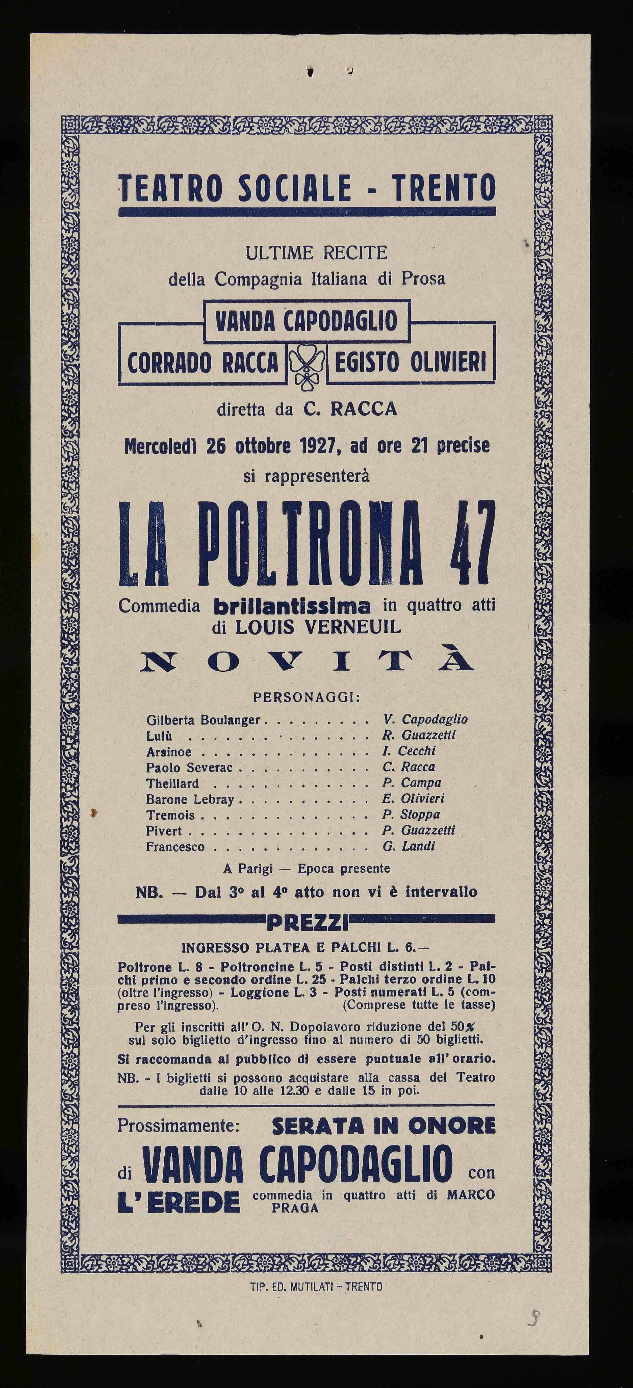 Teatro Sociale – Trento. Mercoledì 26 ottobre 1927, ad ore 21 precise