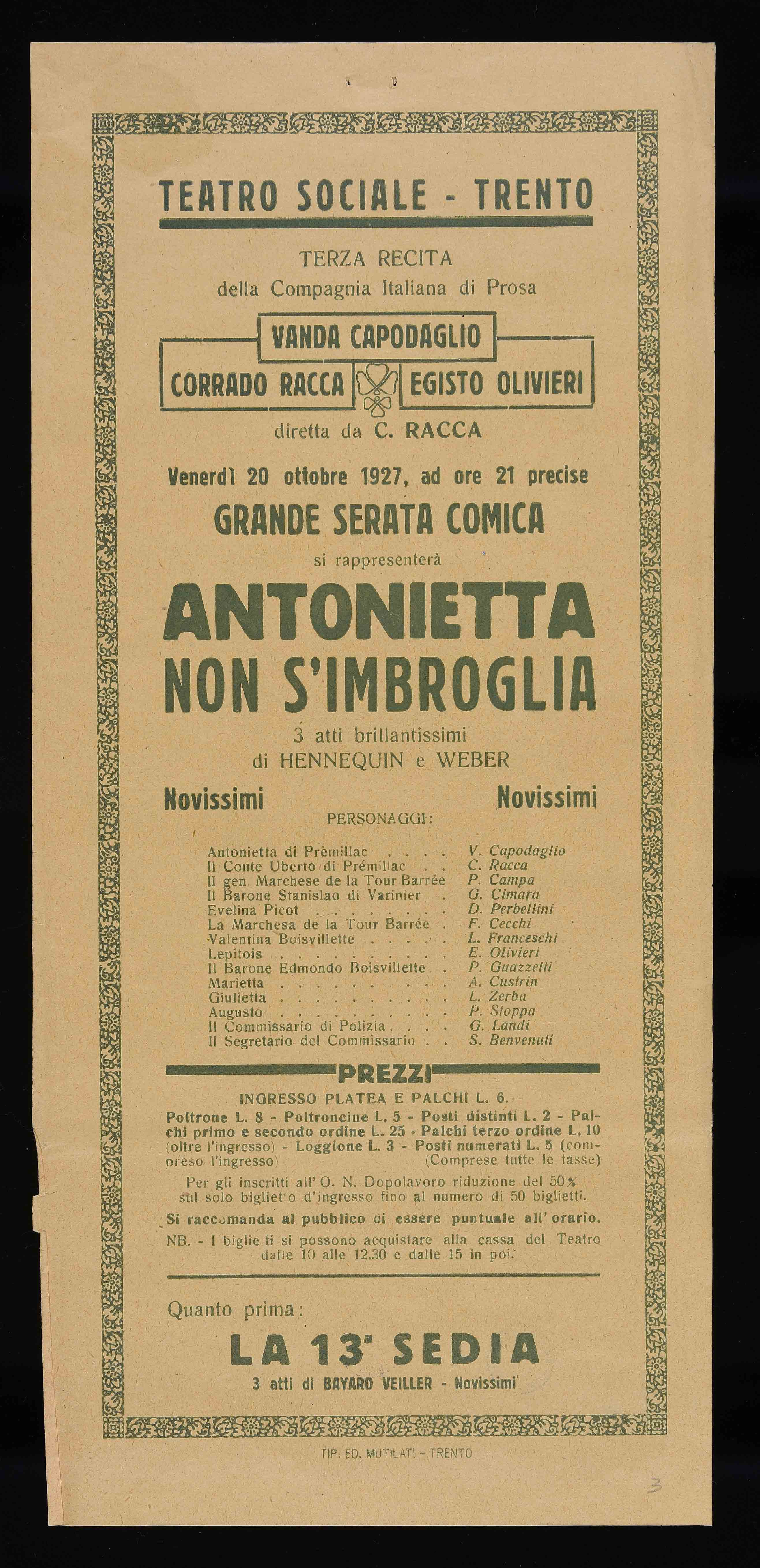Teatro Sociale – Trento. Venerdì 20 ottobre 1927, ad ore 21 precise