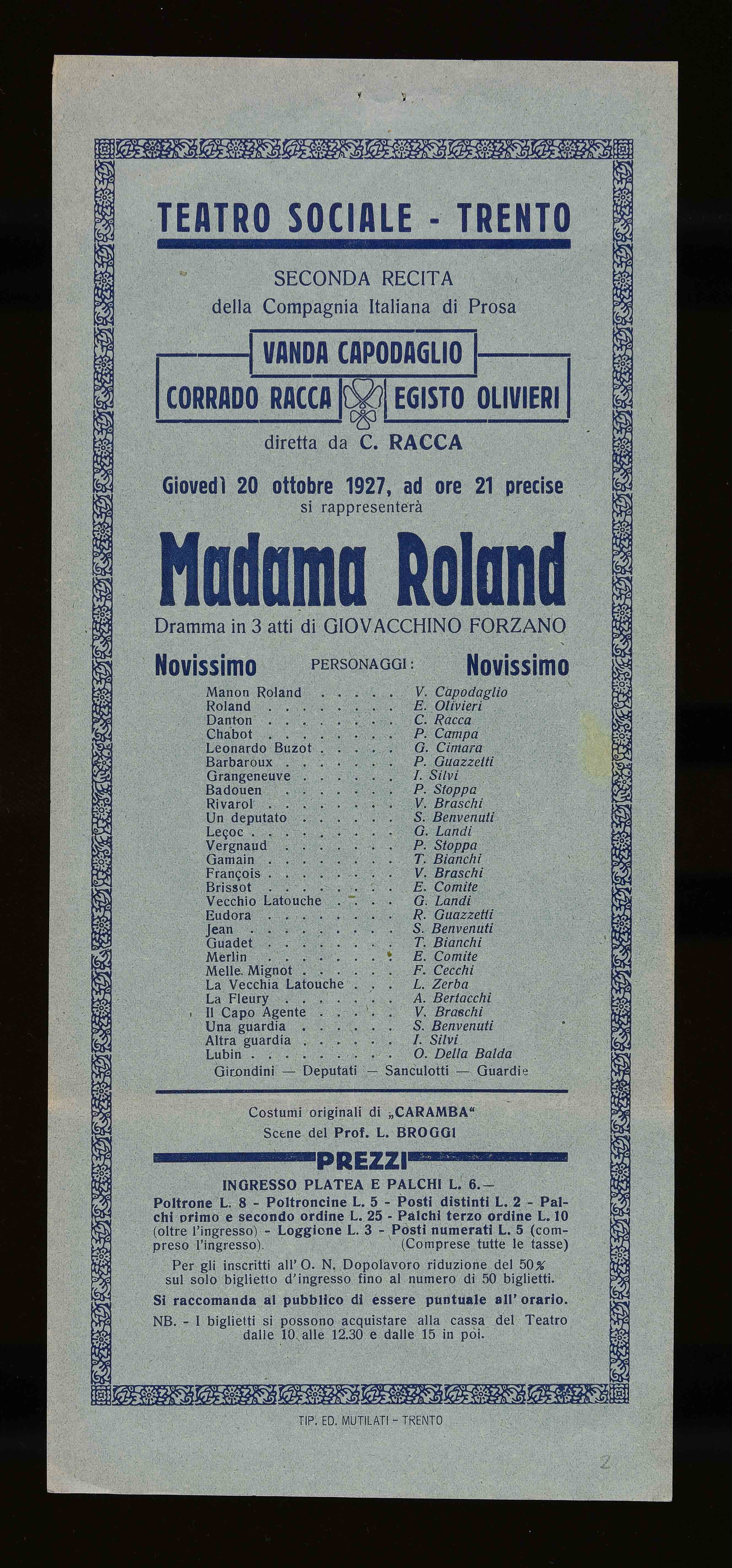 Teatro Sociale – Trento. Giovedì 20 ottobre 1927, ad ore 21 precise
