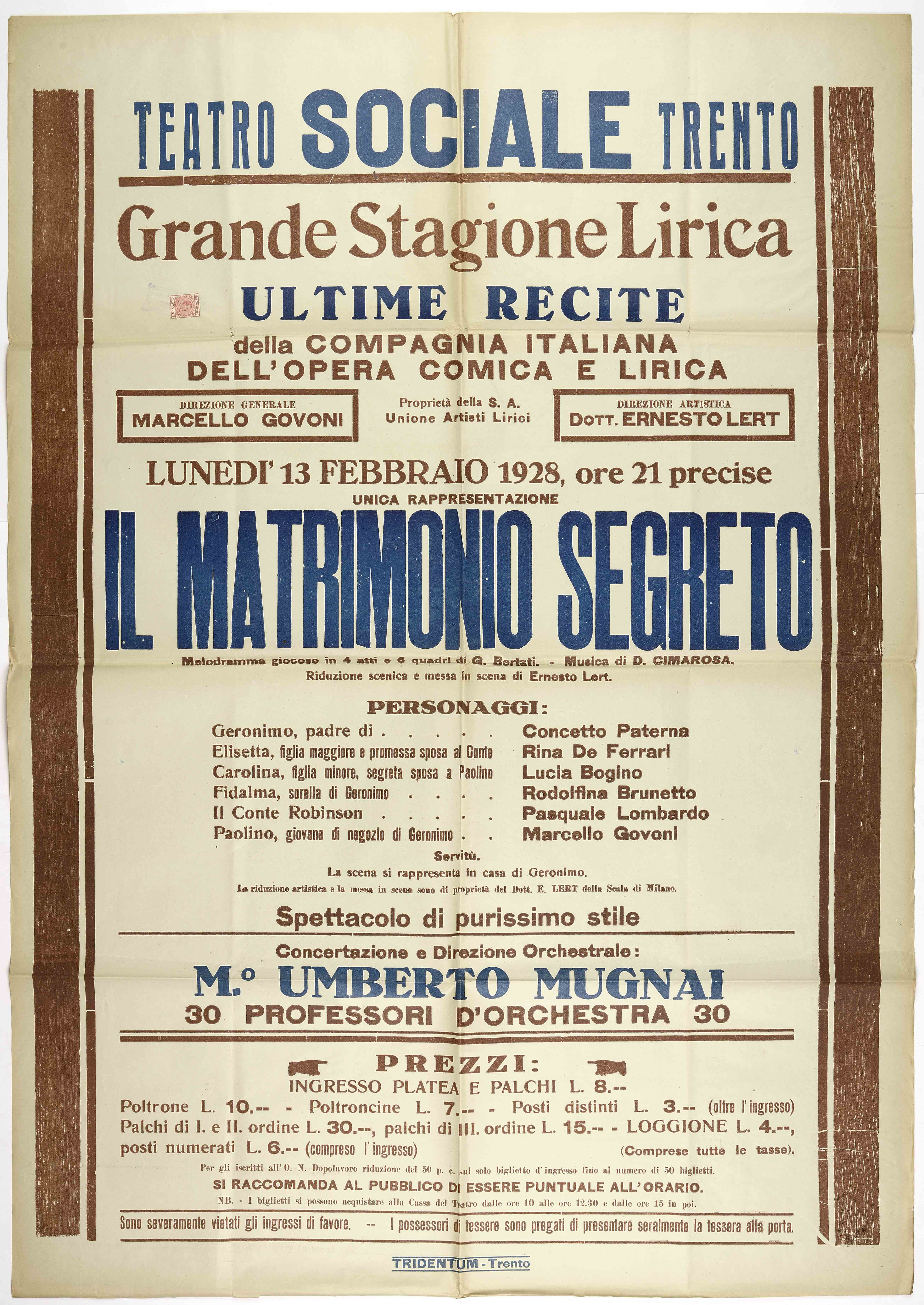 Teatro Sociale – Trento. Lunedì 13 febbraio 1928, ore 21 precise