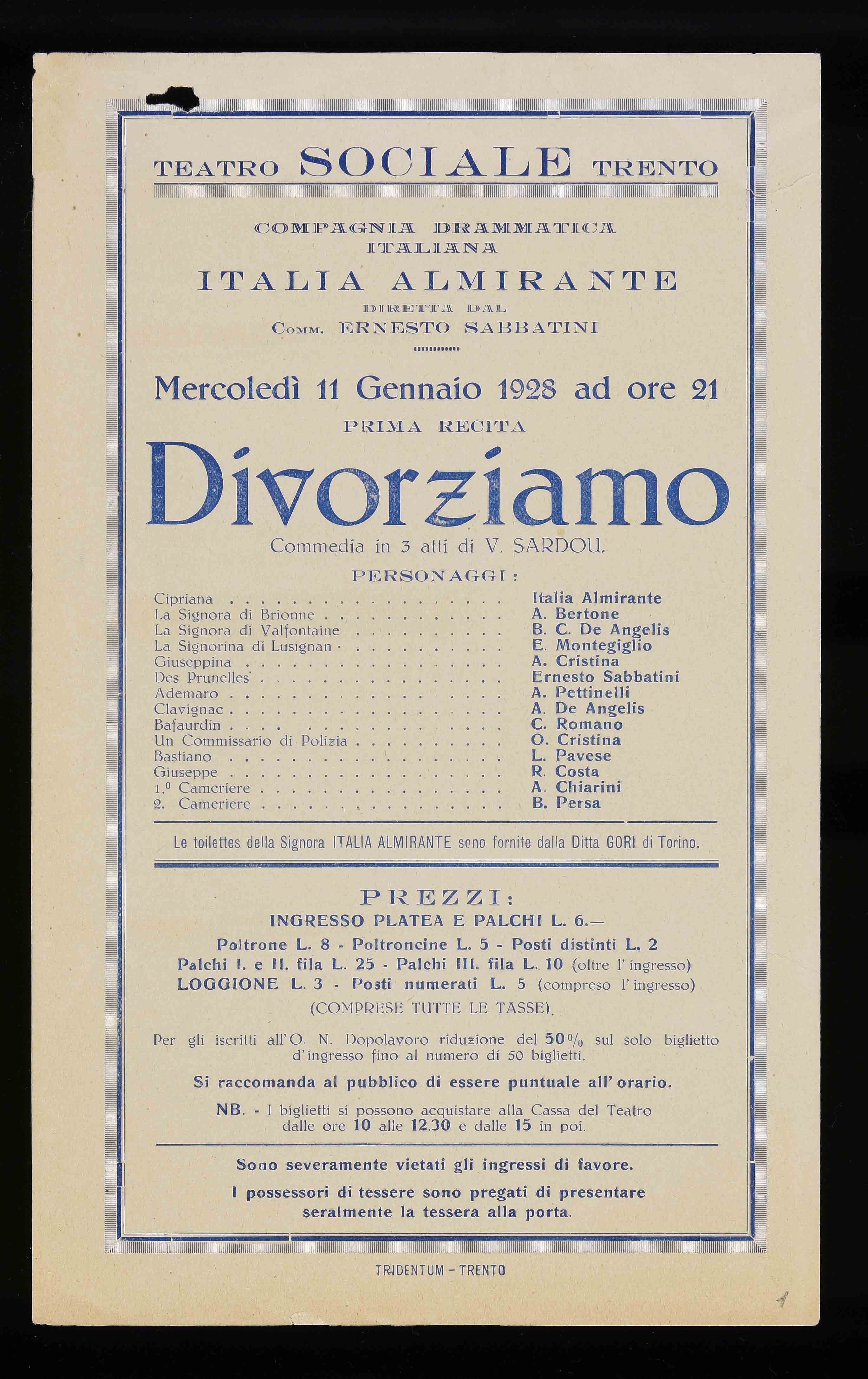 Teatro Sociale – Trento. Mercoledì 11 gennaio 1928 ad ore 21