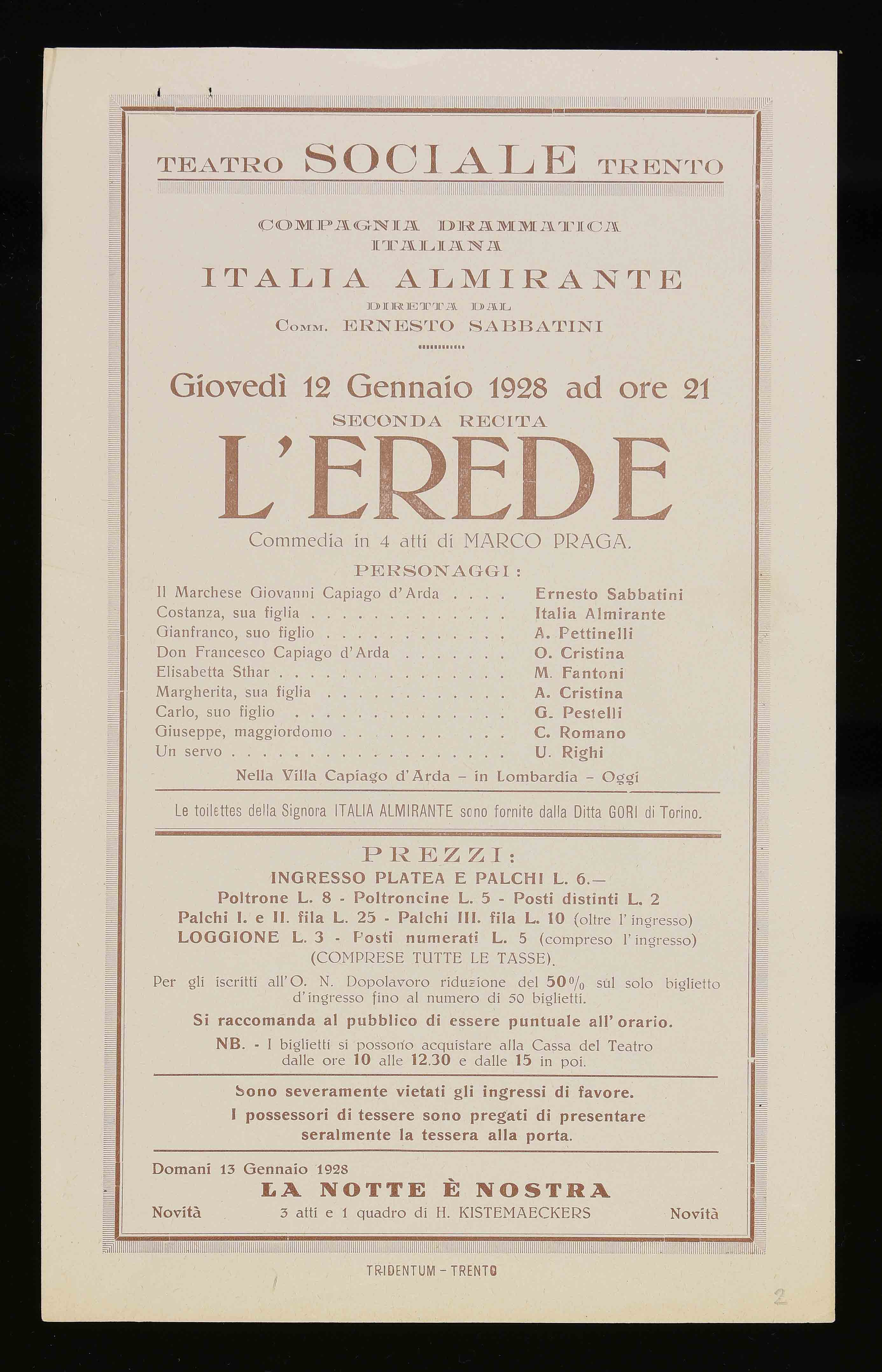 | Teatro Sociale – Trento. Giovedì 12 gennaio 1928 ad ore 21 |