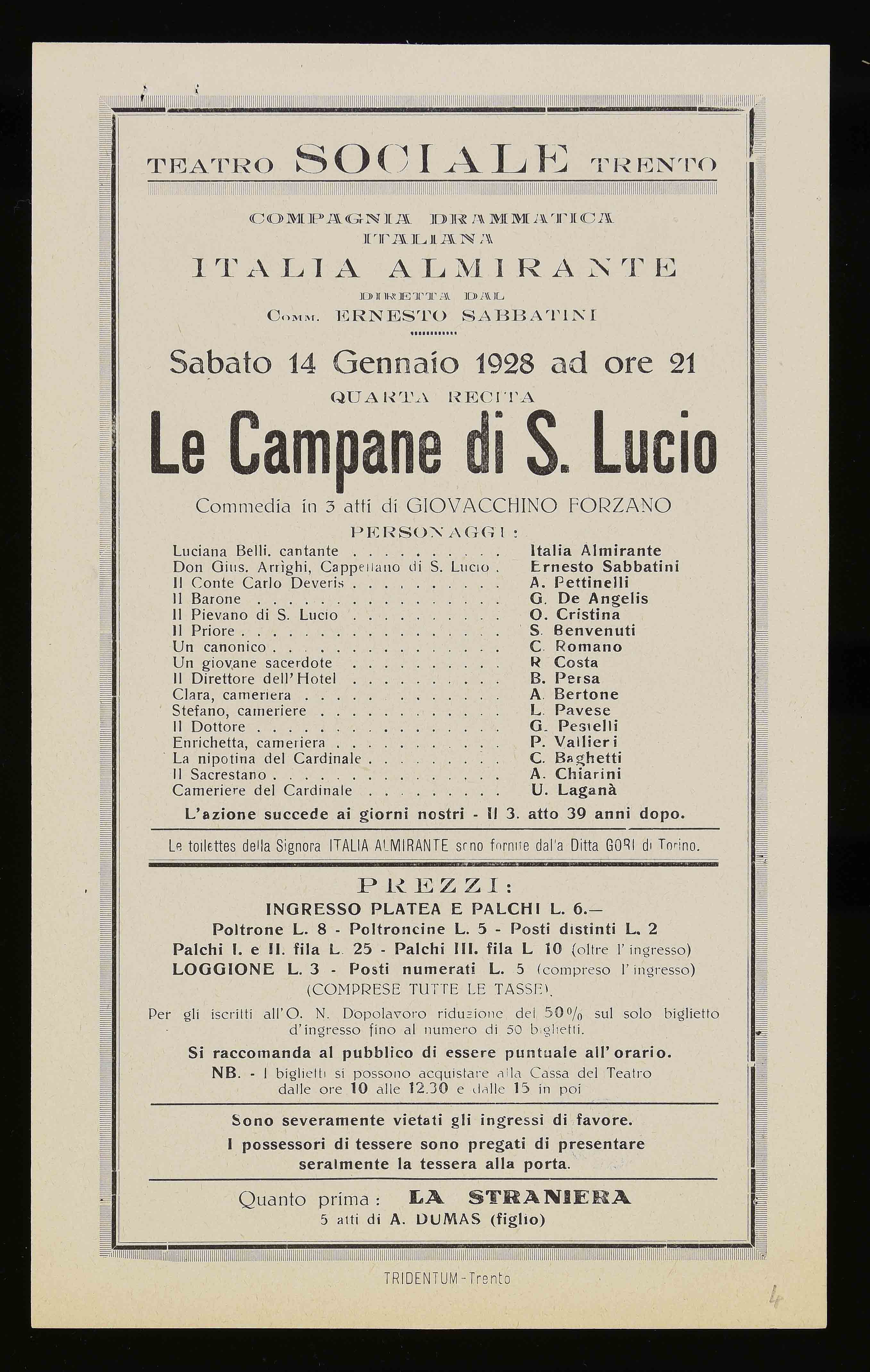 Teatro Sociale – Trento. Sabato 14 gennaio 1928 ad ore 21