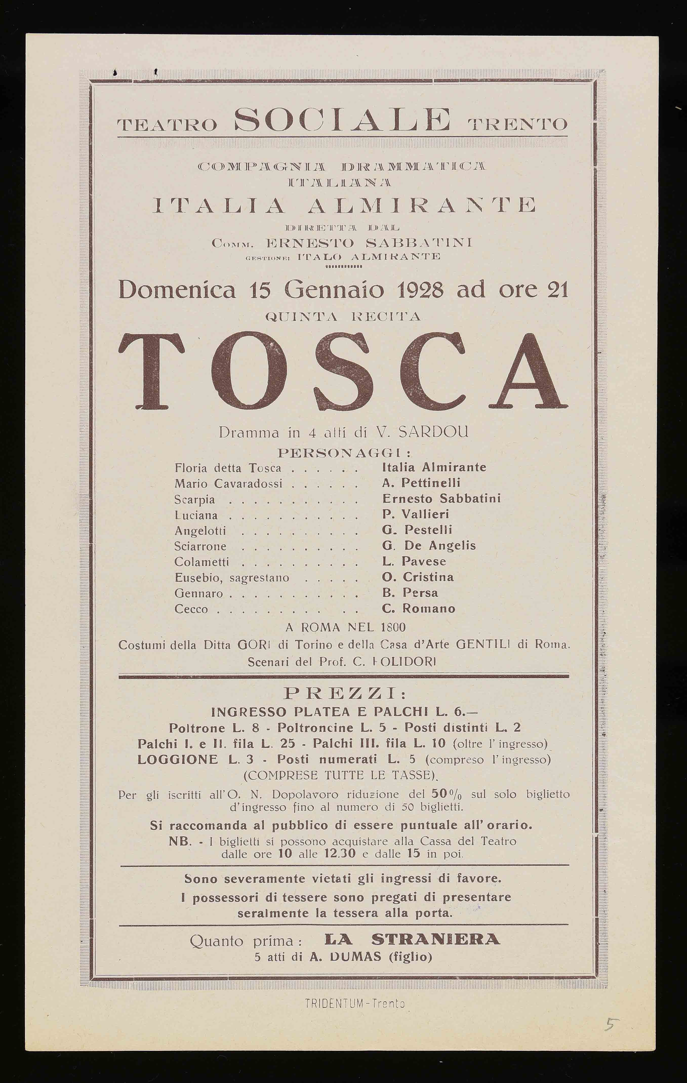 Teatro Sociale – Trento. Domenica 15 gennaio 1928 ad ore 21