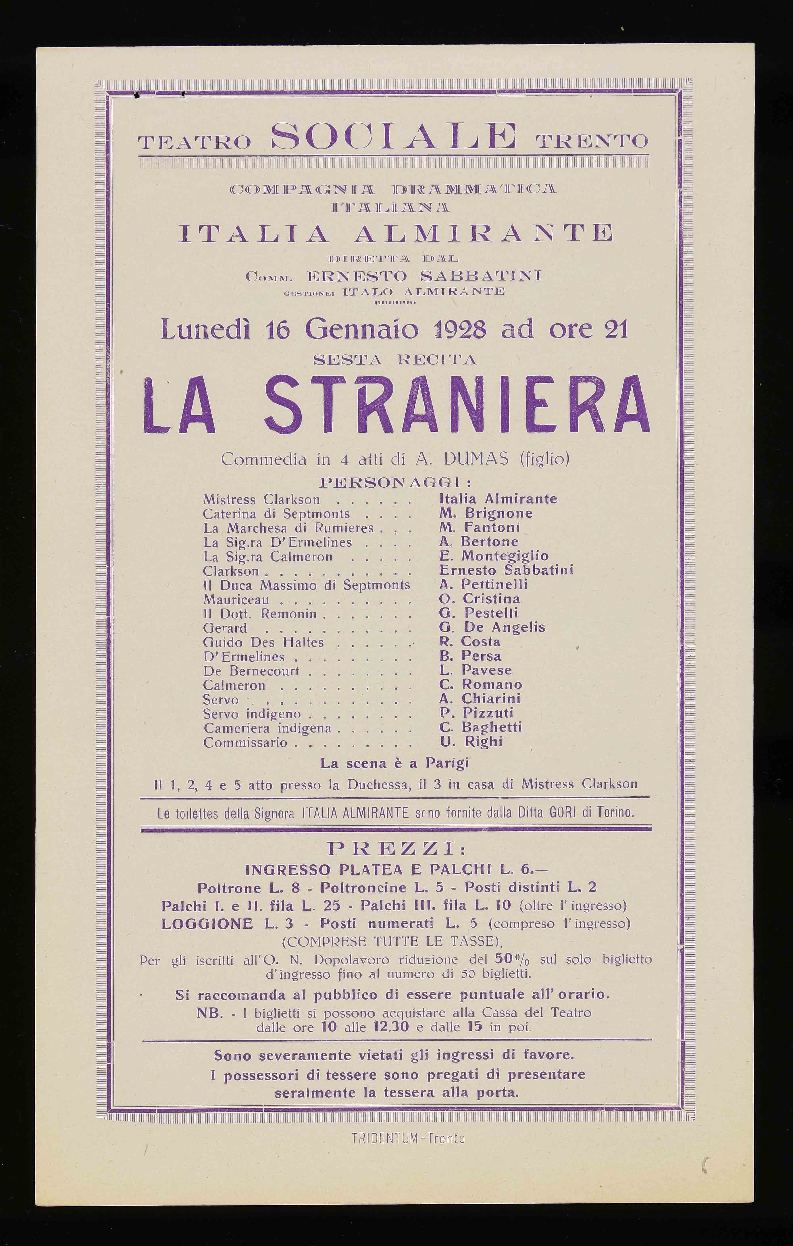 | Teatro Sociale – Trento. Lunedì 16 gennaio 1928 ad ore 21 |