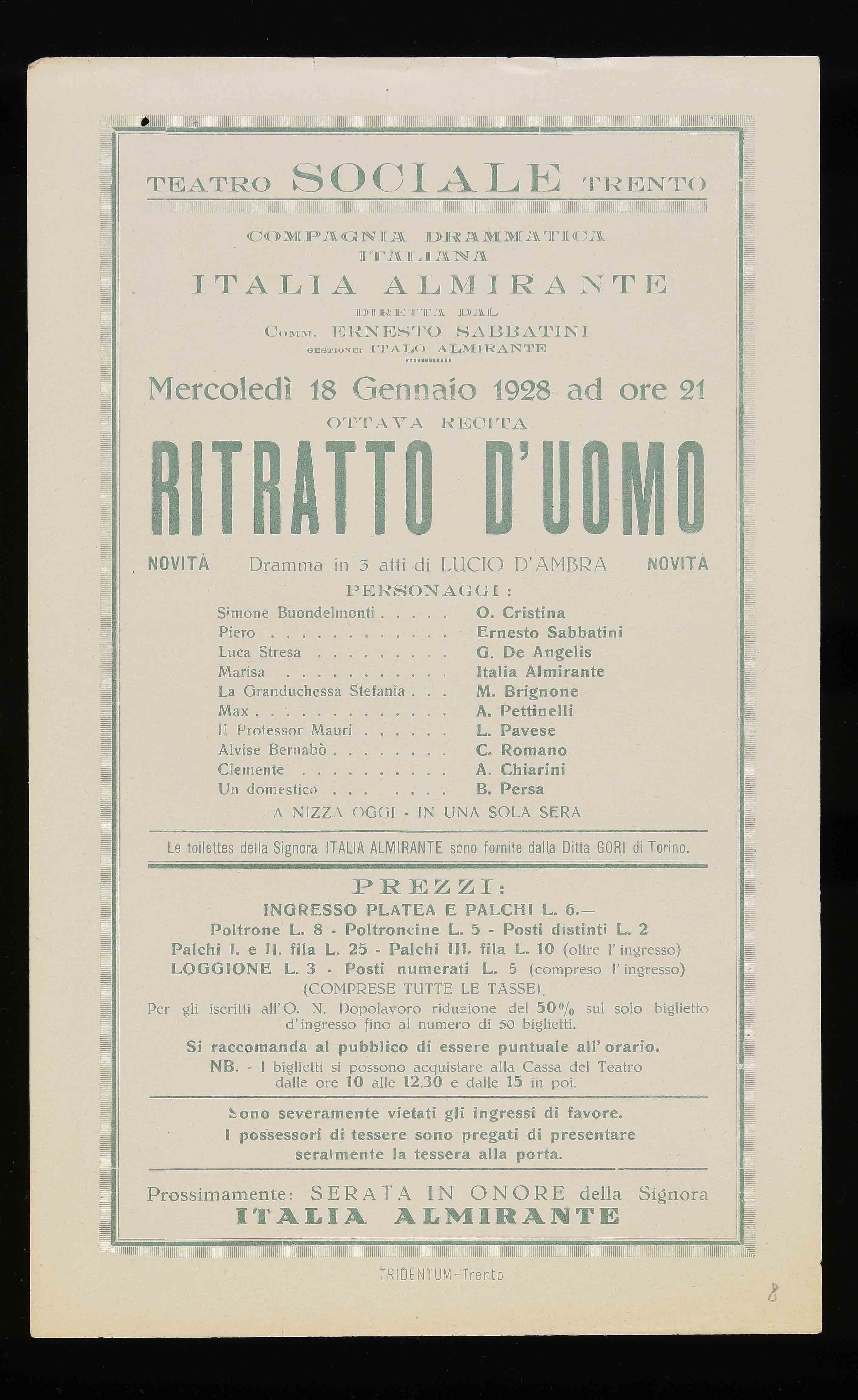 | Teatro Sociale – Trento. Mercoledì 18 gennaio 1928 ad ore 21 |