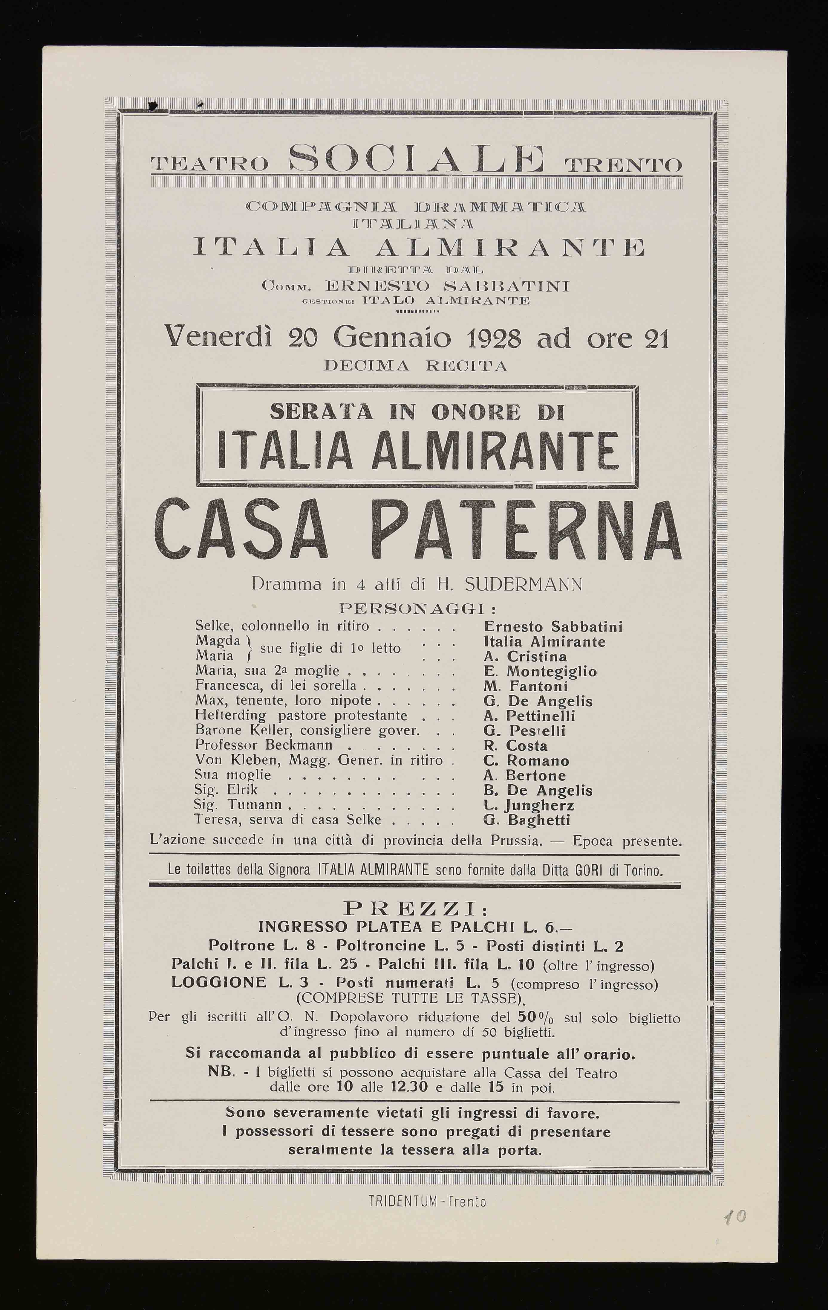 | Teatro Sociale – Trento. Venerdì 20 gennaio 1928 ad ore 21 |