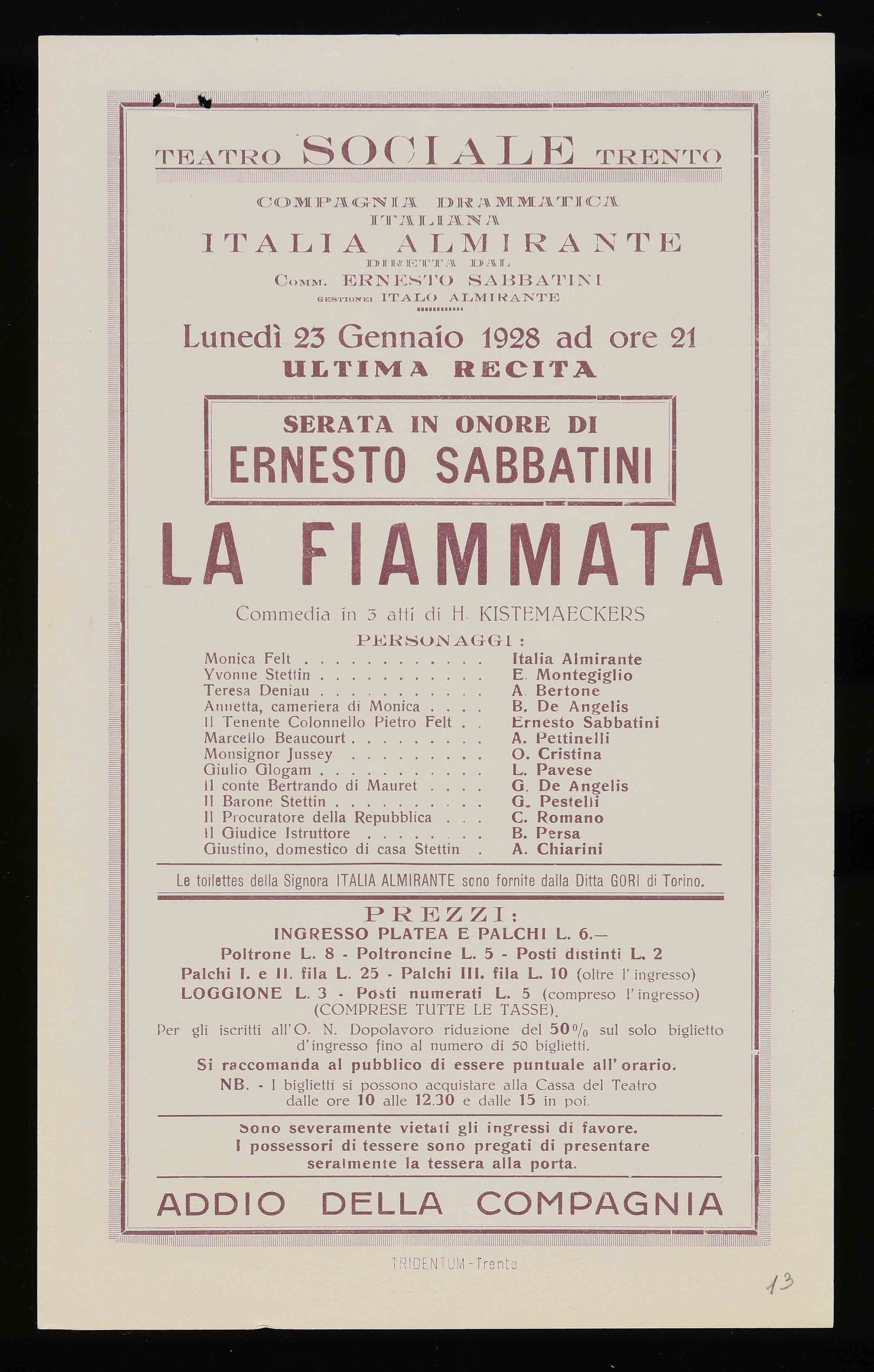 | Teatro Sociale – Trento. Lunedì 23 gennaio 1928 ad ore 21 |