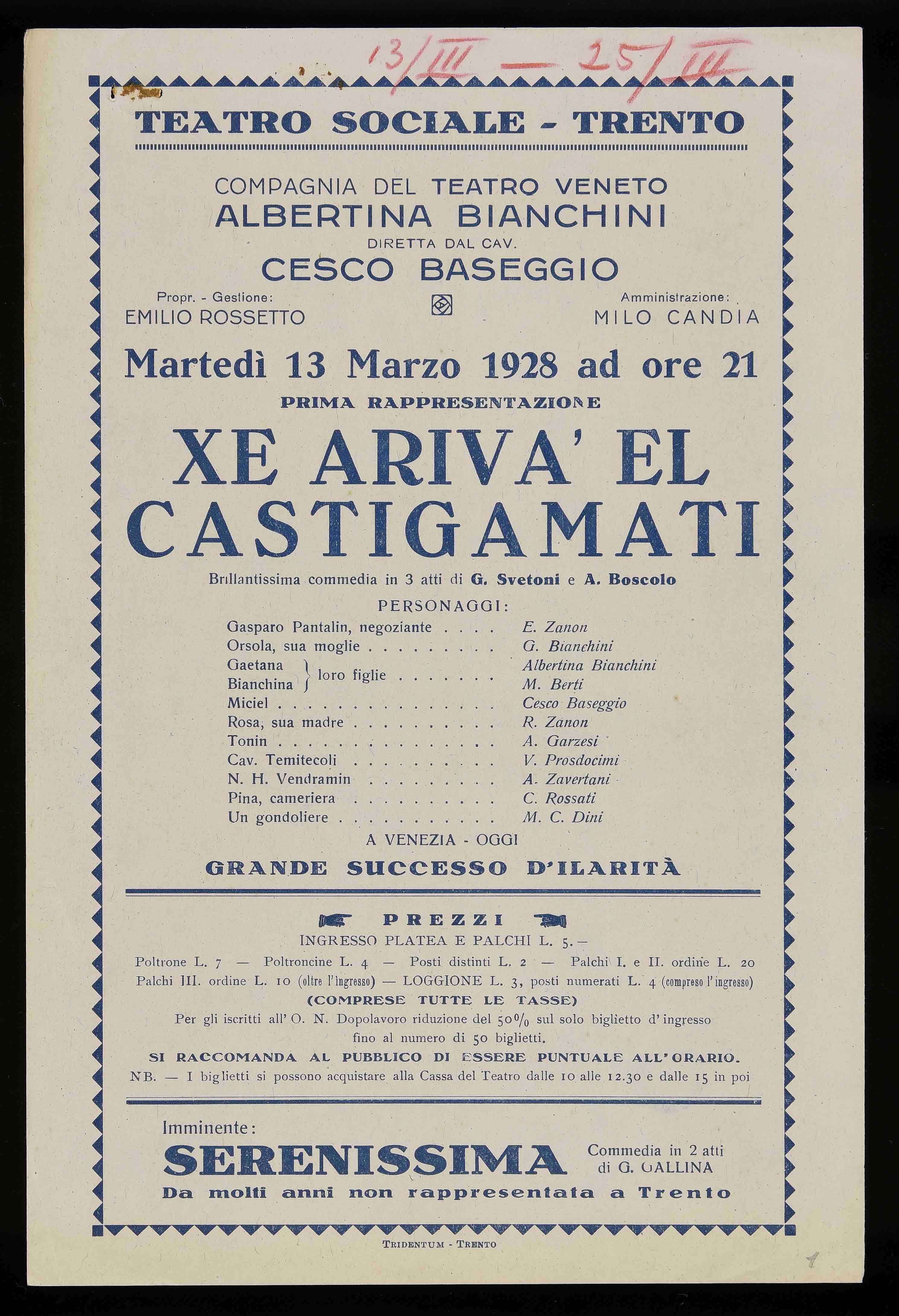 | Teatro Sociale – Trento. Martedì 13 marzo 1928 ad ore 21 |
