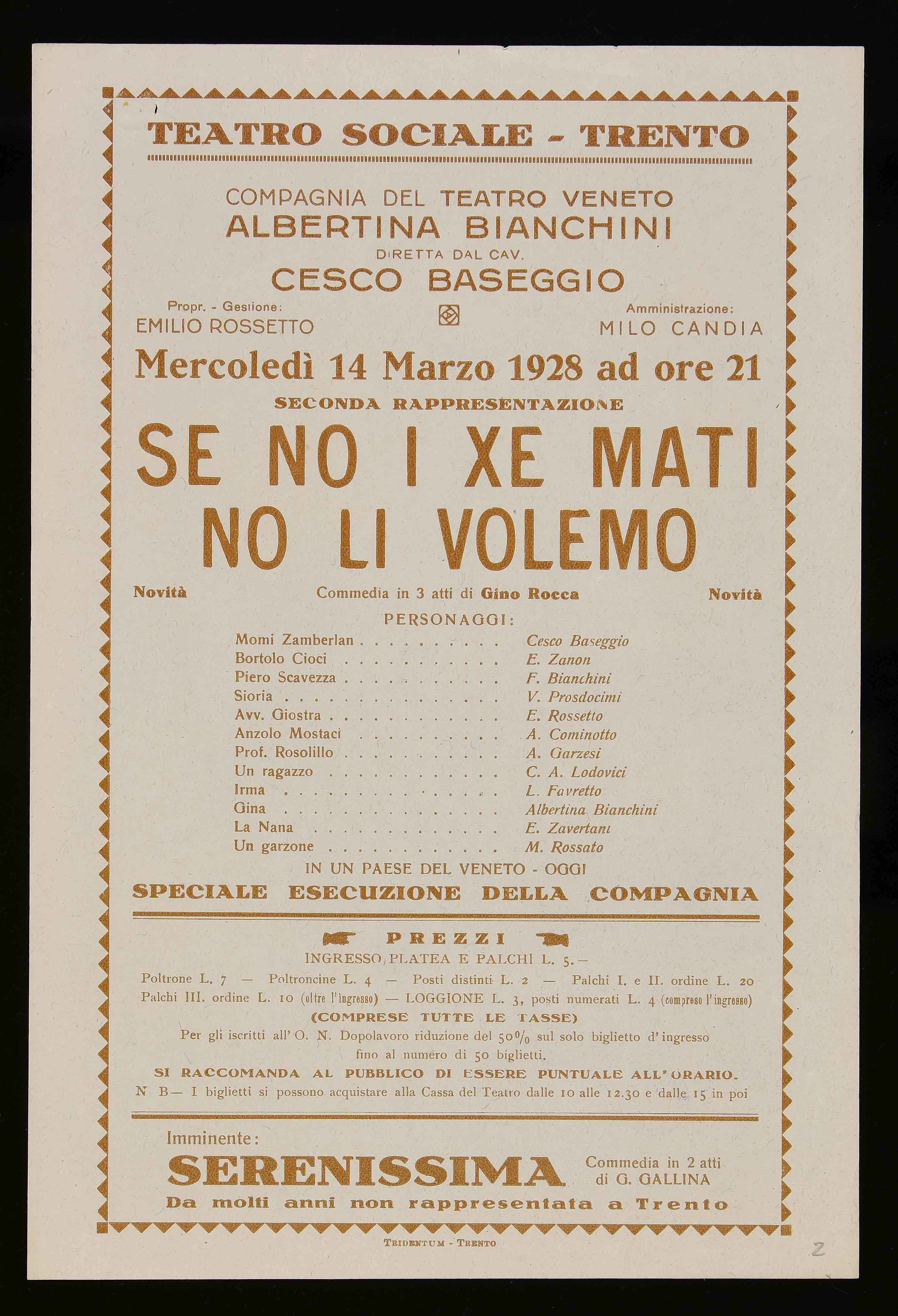 | Teatro Sociale – Trento. Mercoledì 14 marzo 1928 ad ore 21 |