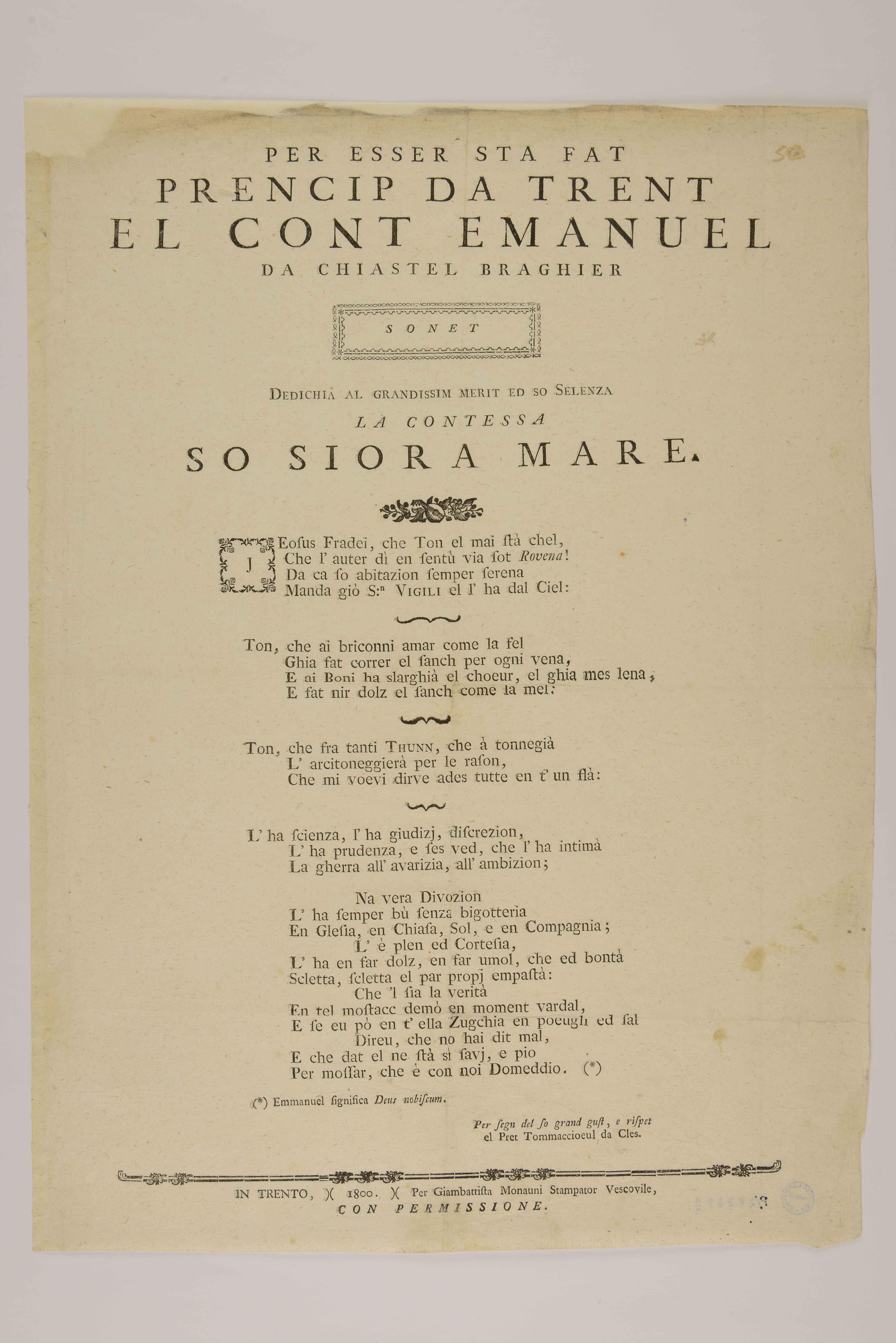| Per esser sta fat prencip da Trent el cont Emanuel da Chiastel Braghier. Sonet dedichià al grandissim merit ed so selenza la contessa so siora mare |