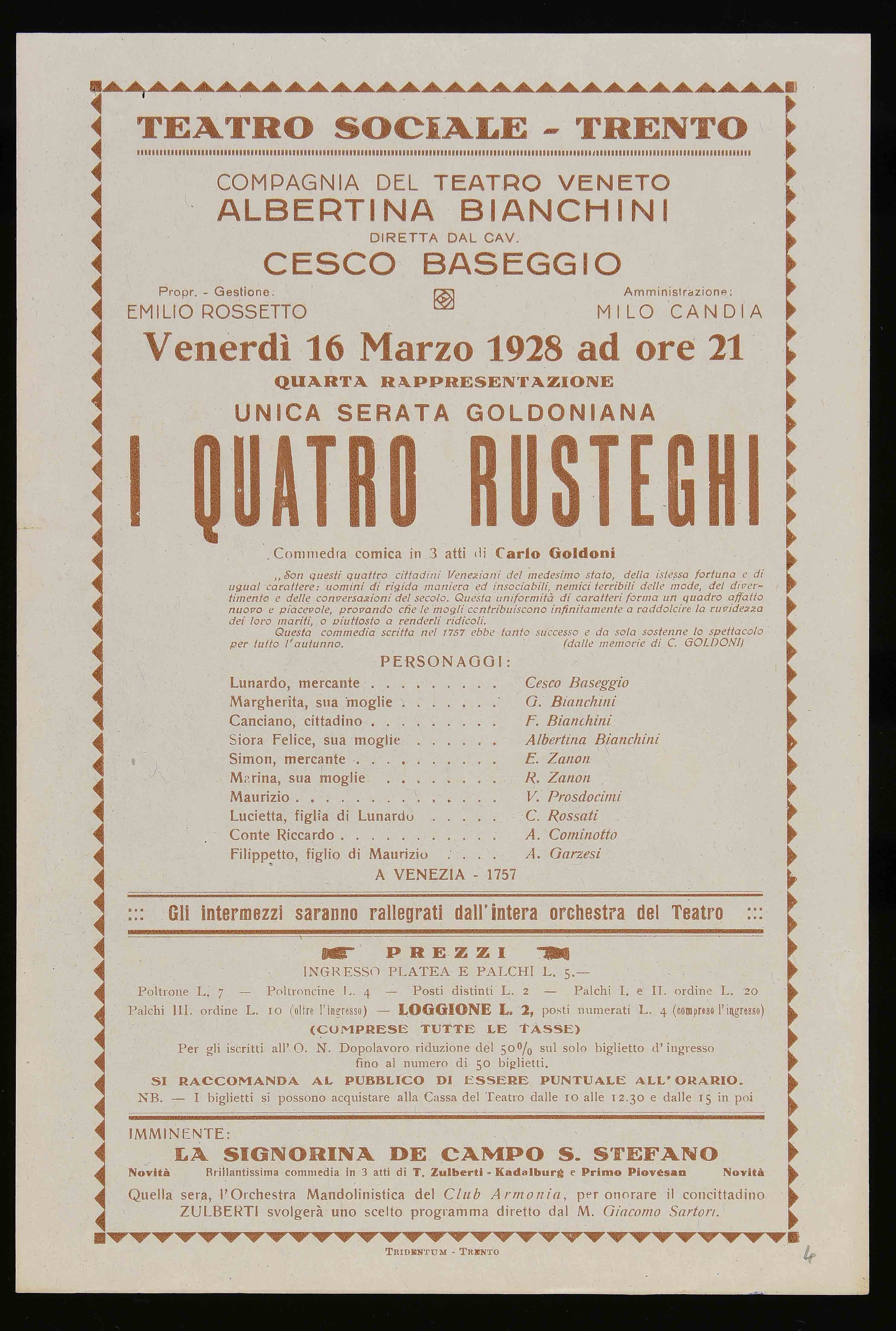 | Teatro Sociale – Trento. Venerdì 16 marzo 1928 ad ore 21 |