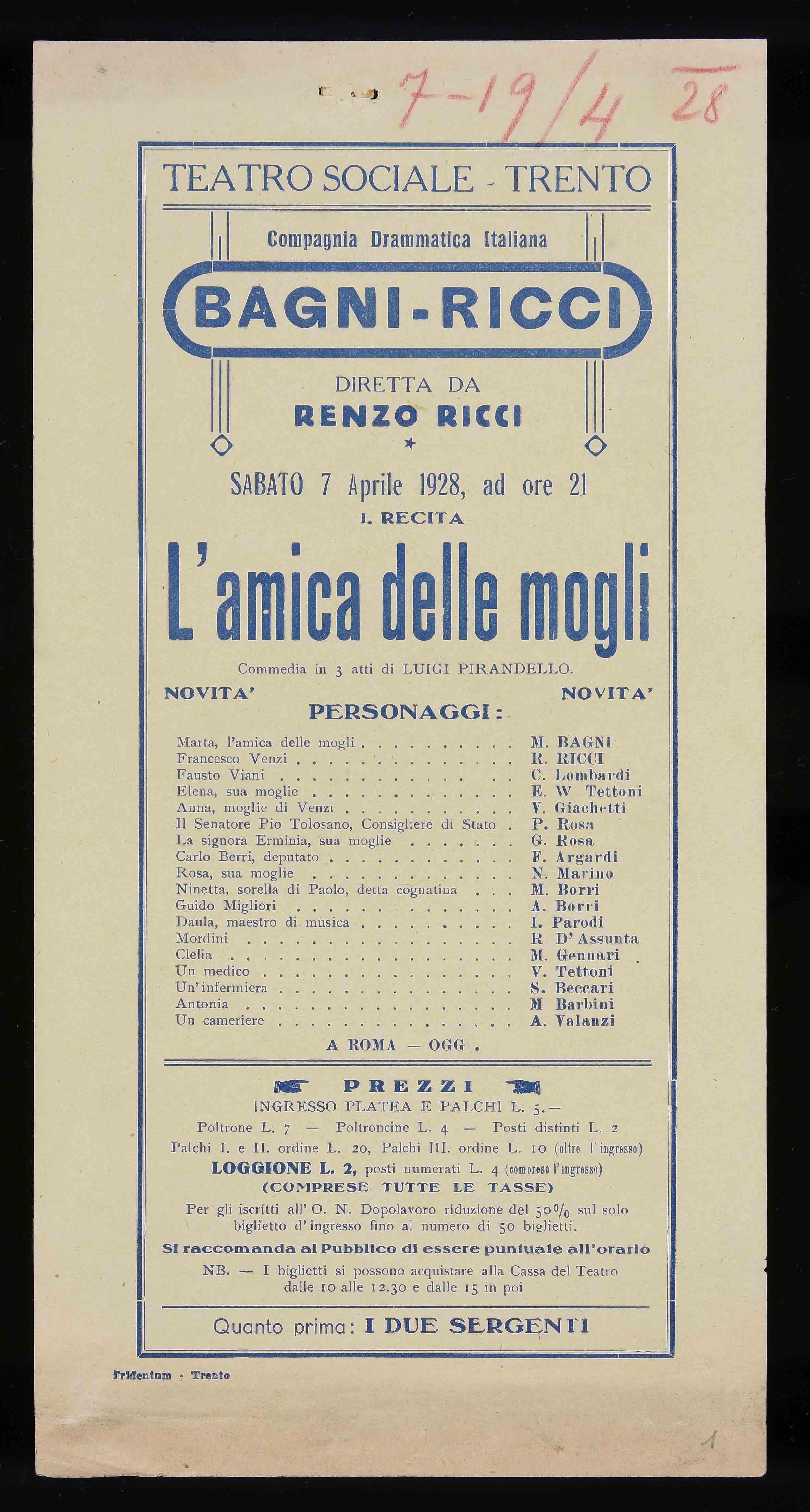 Teatro Sociale – Trento. Sabato 7 aprile 1928, ad ore 21
