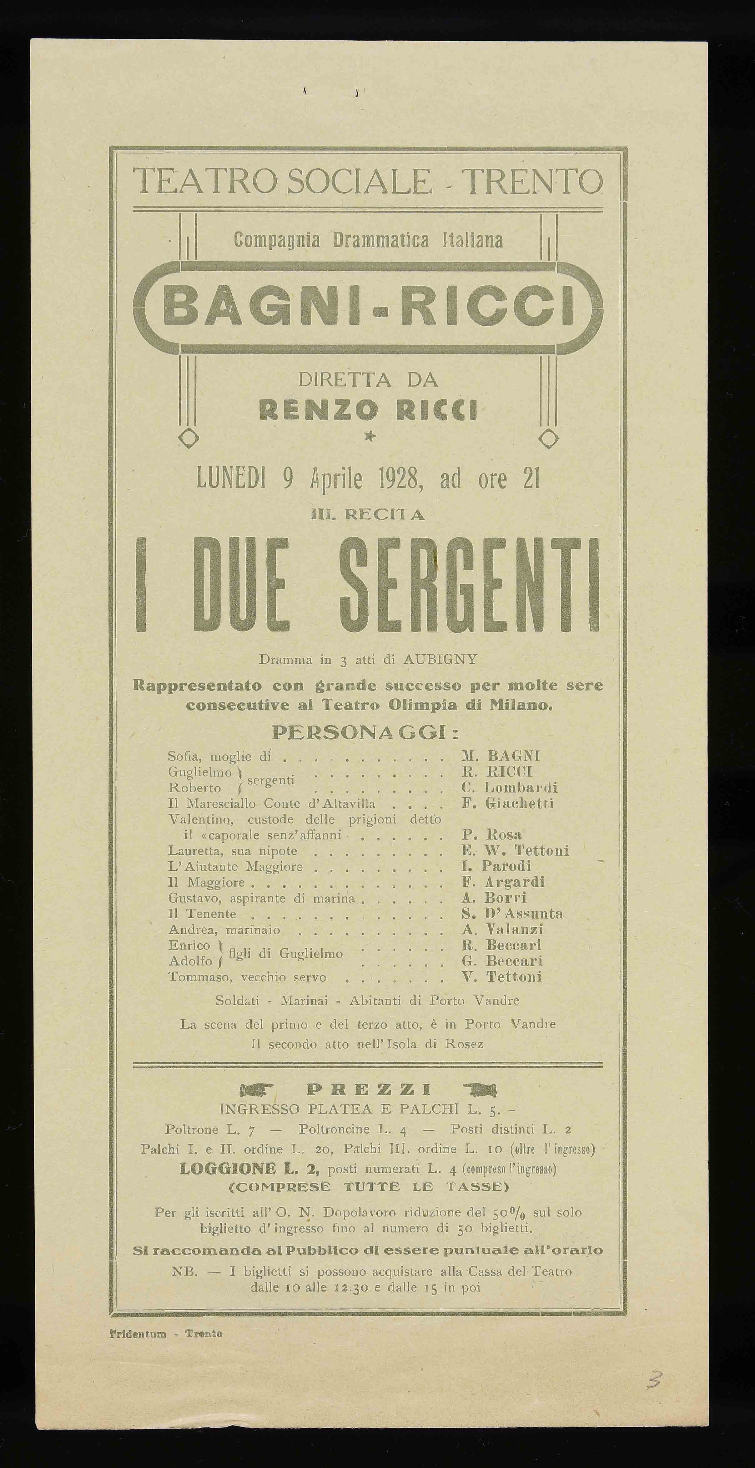 | Teatro Sociale – Trento. Lunedì 9 aprile 1928, ad ore 21 |