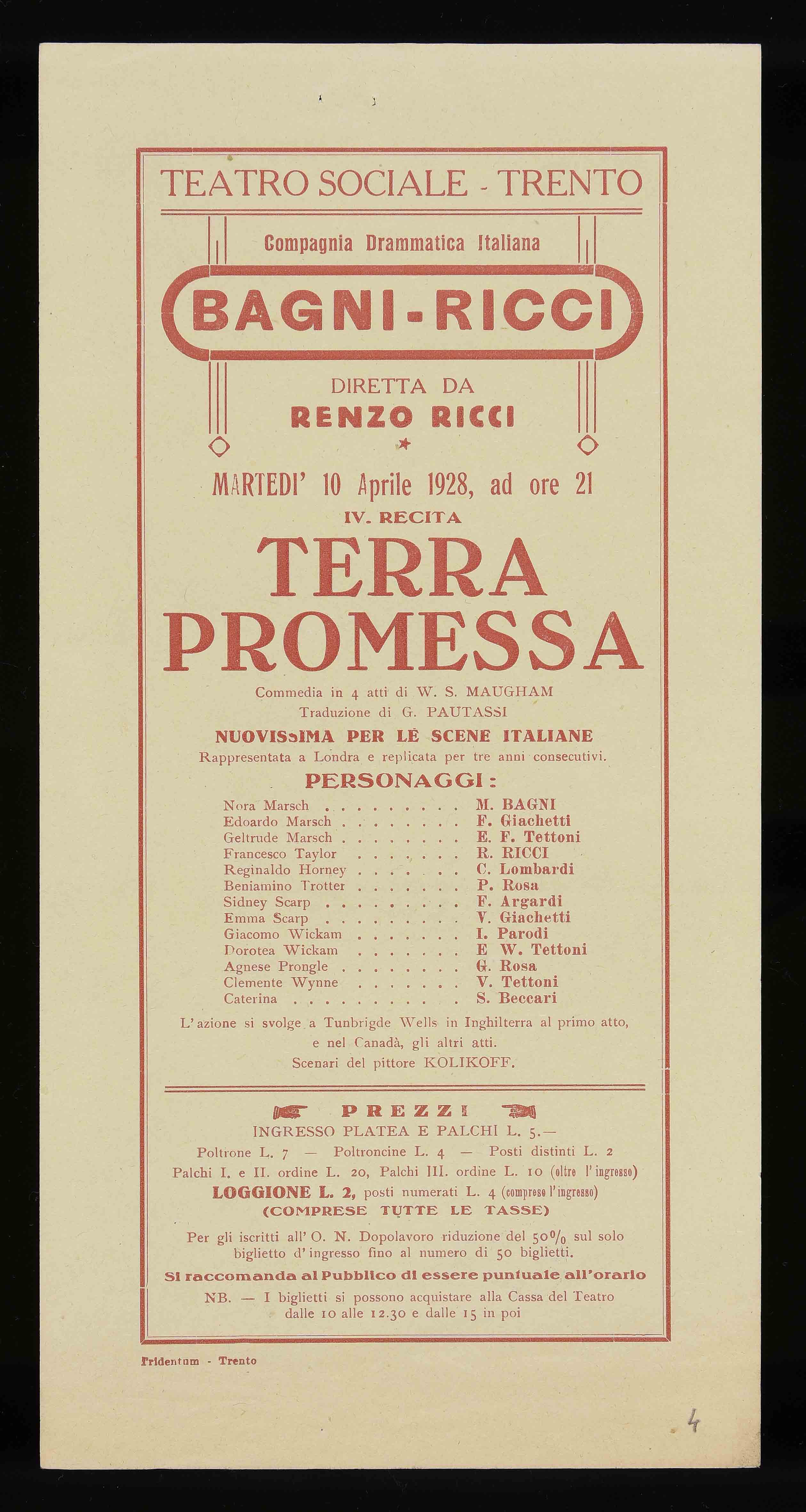 | Teatro Sociale – Trento. Martedì 10 aprile 1928, ad ore 21 |
