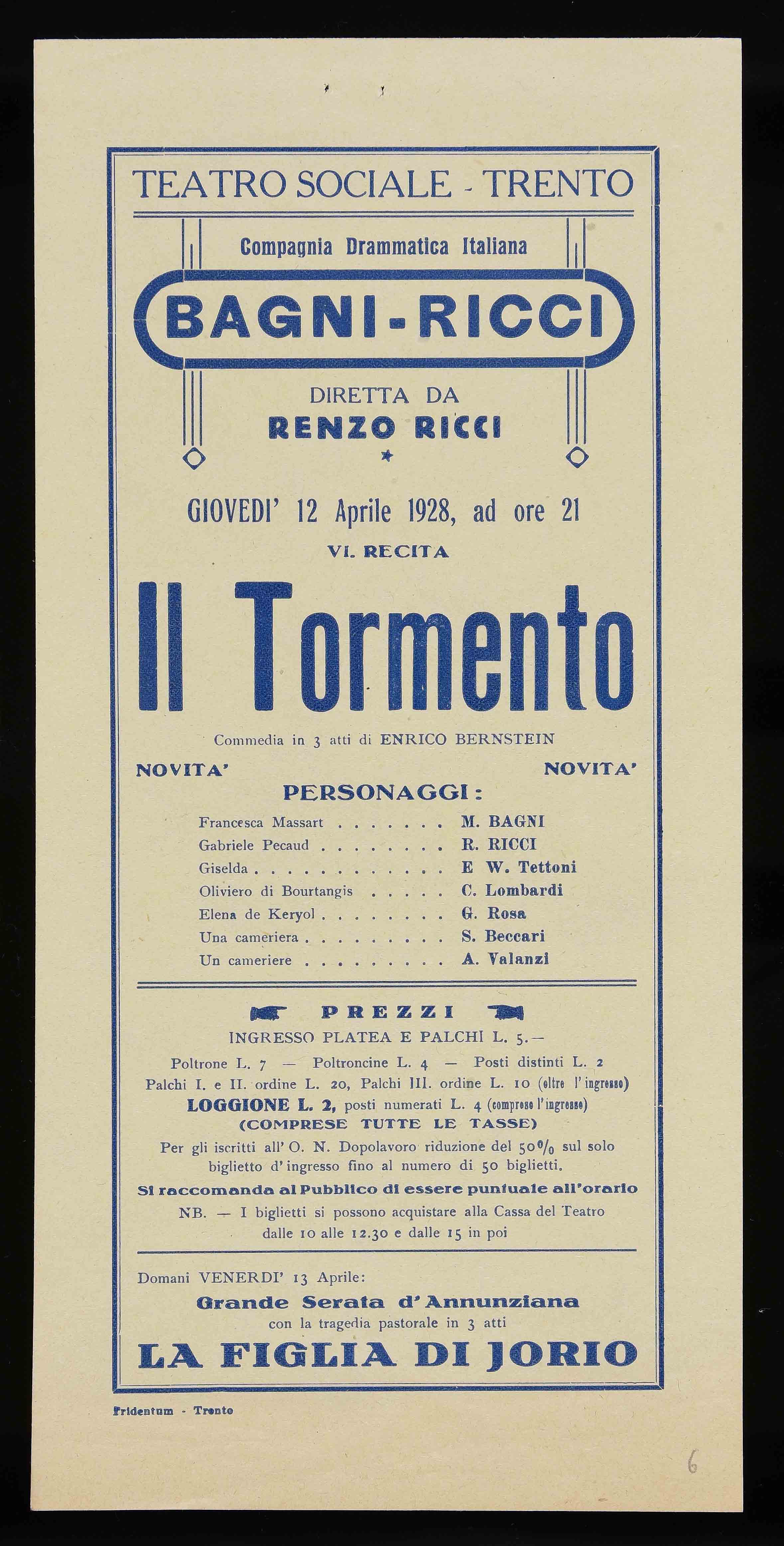| Teatro Sociale – Trento. Giovedì 12 aprile 1928, ad ore 21 |