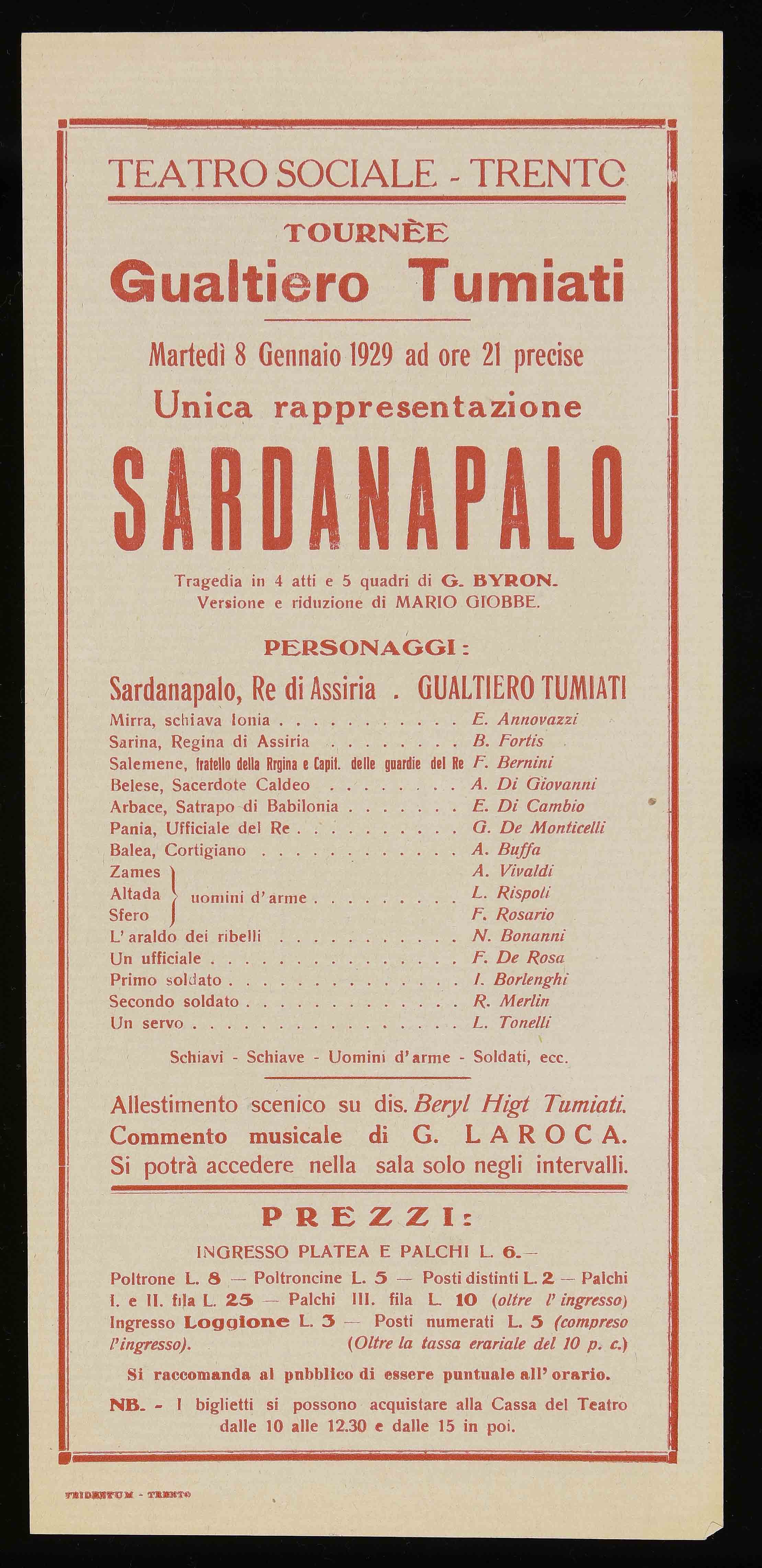 | Teatro Sociale – Trento. Martedì 8 gennaio 1929 ad ore 21 precise |